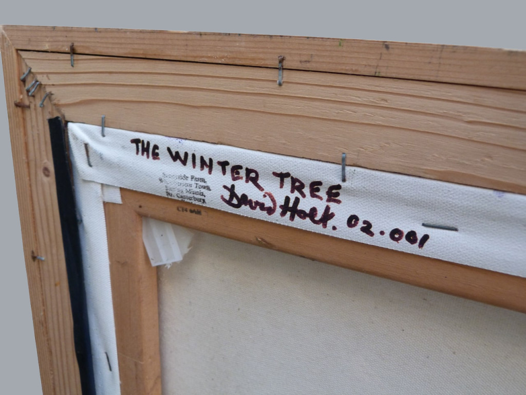 Painted in February 2001, this is a large oil on canvas, framed (but not glazed). The frame measures 85 × 60cm, and painting measures 76 × 51cm. The inner layer of the frame has been hand-tinted in the tones of the painting, and the facing edge of the frame has a light white wash. The frame was made specifically for this painting by the artist.