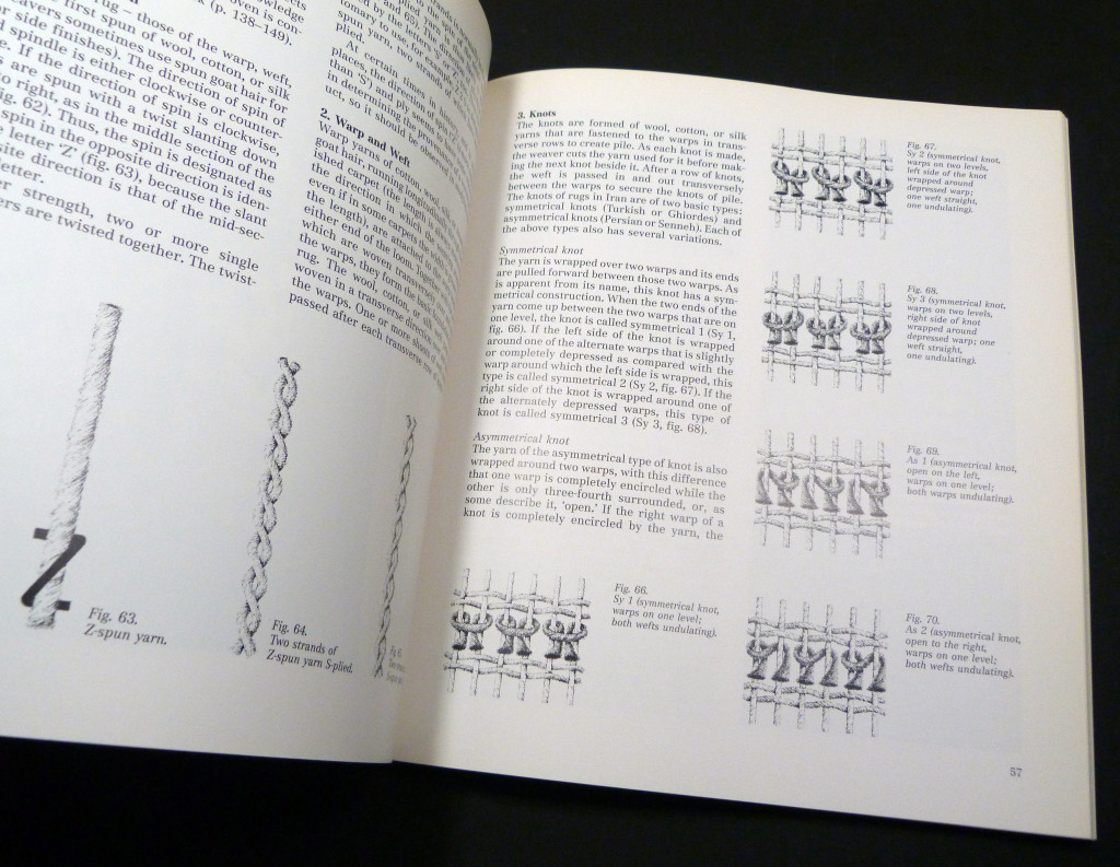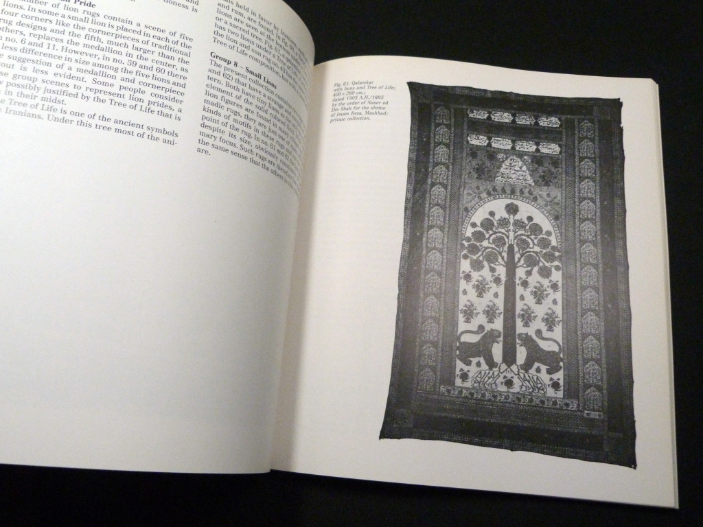 An illustrated study of the beautiful lion rugs of Iran, looking at the lion motif in art and weaving, it's importance as guardian and talisman, and which areas lion rugs were created and who were the weavers. There is also classification: lions with manes, lions inspired by stone lion, tigerlike and leopardlike lions, lion and sun, lion in a hunting ground, lion and lioness etc, and finally an explanation of the structural characteristics of the rugs. Illustrated throughout, mostly in black and white but with a few plates in colour.