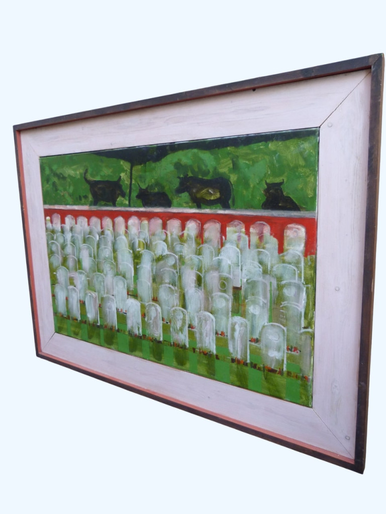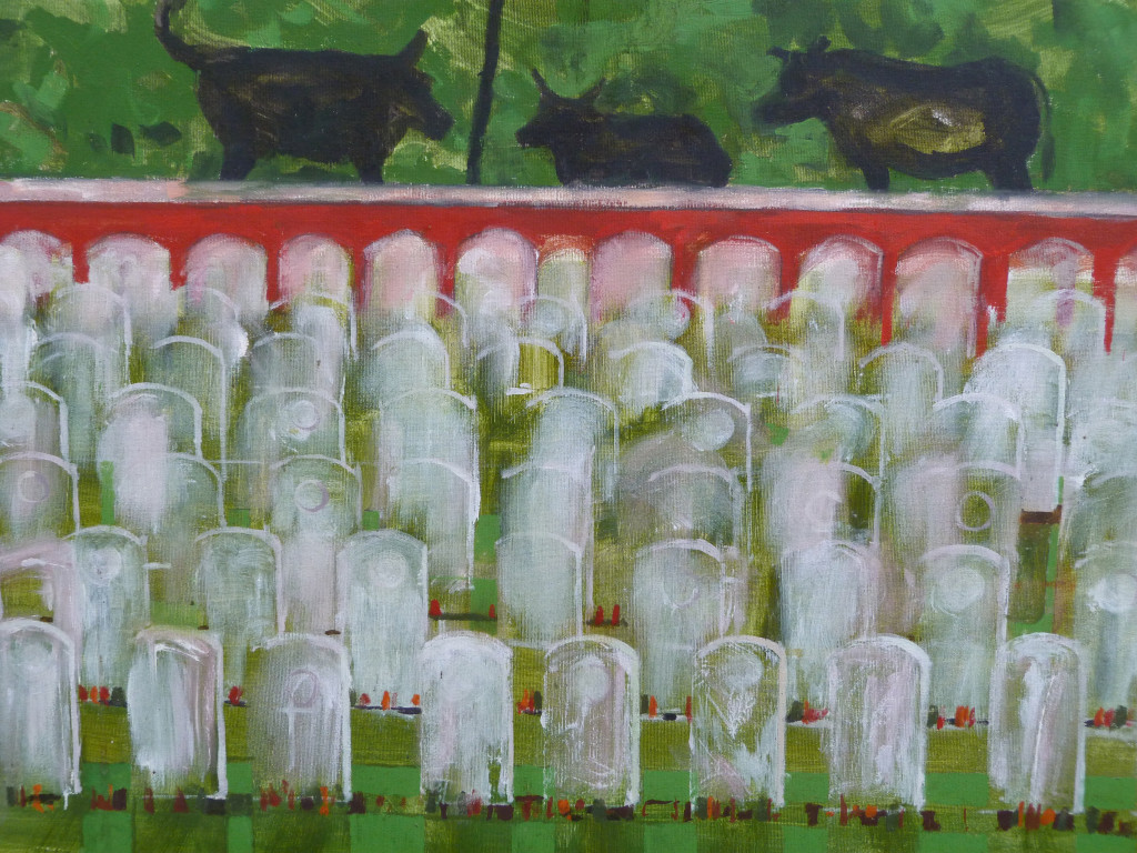 This painting was inspired by a tour of the Great War cemeteries of the Somme (where David's father fought), and by Wilfred Owen's poem Anthem for a Doomed Youth (What passing-bells for these who die as cattle? / Only the monstrous anger of the guns. / Only the stuttering rifles' rapid rattle / Can patter out their hasty orisons.) The canvas showing the immaculately kept lines of Portland Stone graves, with dashes of red around them for the poppies that grow there. In the background, and against the wall of the cemetery, and in contrast to the headstones, are the dark, shadow figures of the cattle. A poignant and moving painting, with a ghostly ethereal quality.