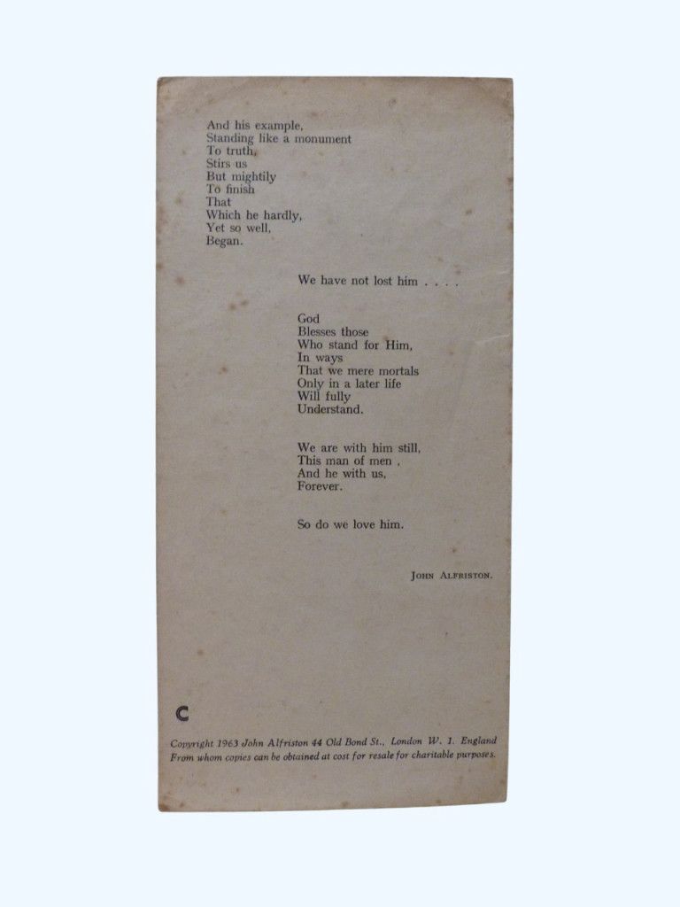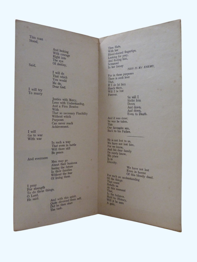 A tribute in verse to the late President John F Kennedy. The cover carries a portrait of JFK, and the poem is printed over the remaining three pages. Here a flavour of the poem: "This man stood / and looking / with courage / right into / the eye / of destiny / said / I will do / that which / you would / me do, / Dear God."