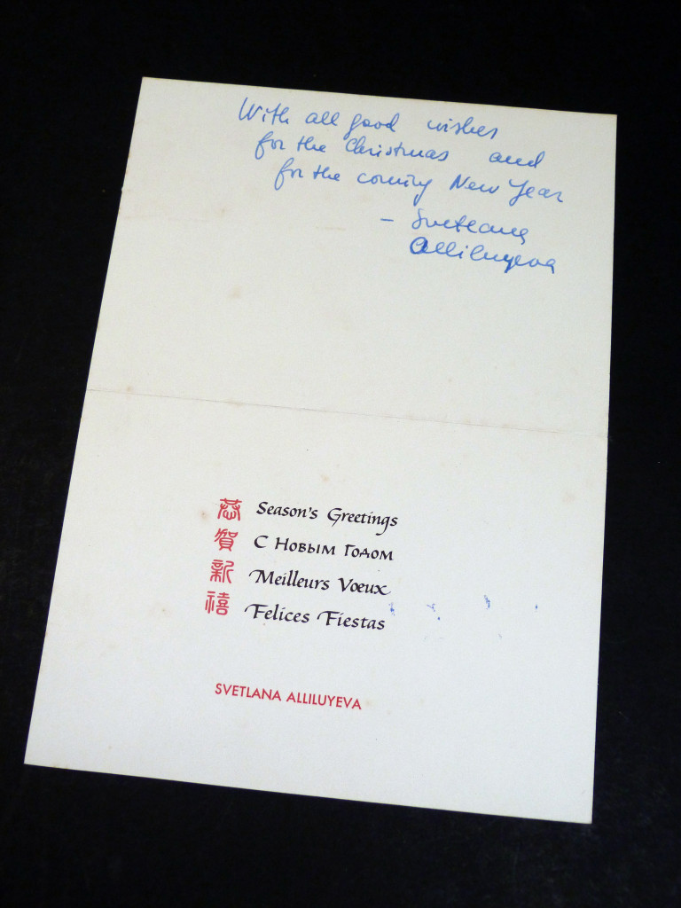 A Christmas card signed by Svetlana Alliluyeva, with the first UK edition, and a Russian language limited edition