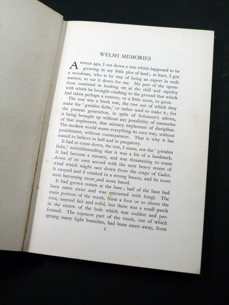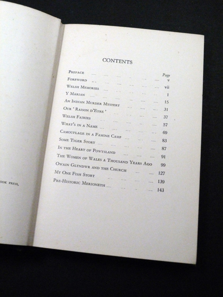 A posthumous collection of essays and pieces by Thomas Peter Ellis (1873–1936), most with a distinctly Welsh flavour, many having appeared in The Welsh Outlook. Ellis had returned to his native Wales after a lengthy time in India as a judge, and here presents his recollections and impressions of things Welsh, such as "Welsh Fairies", "Owain Glyndyr and the Church", "Pre-Historic Merioneth" and "The Women of Wales a Thousand Years Ago". Other topics include "An Indian Murder Mystery".