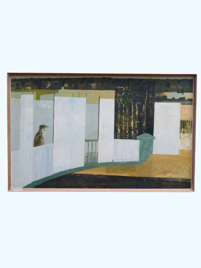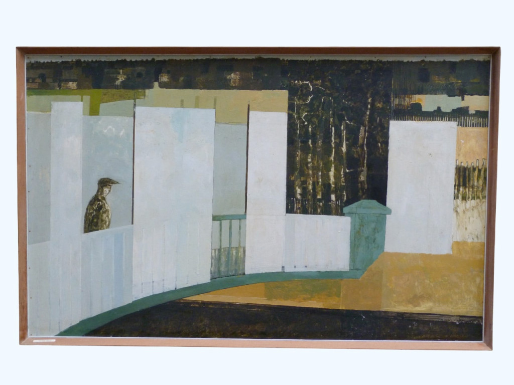 The painted has been titled twice by David, it is "Screened Bridge" in pencil to the rear, and a small exhibition label to the frame calls it "The Grove Bridge". It is a masterful painting, and one of a series that David painted in the 1960s, all featuring a lone hatted figure (known as The Watcher) in a coastal landscape, the setting being the south coast of Kent, with its natural landscape sitting alongside the manmade.