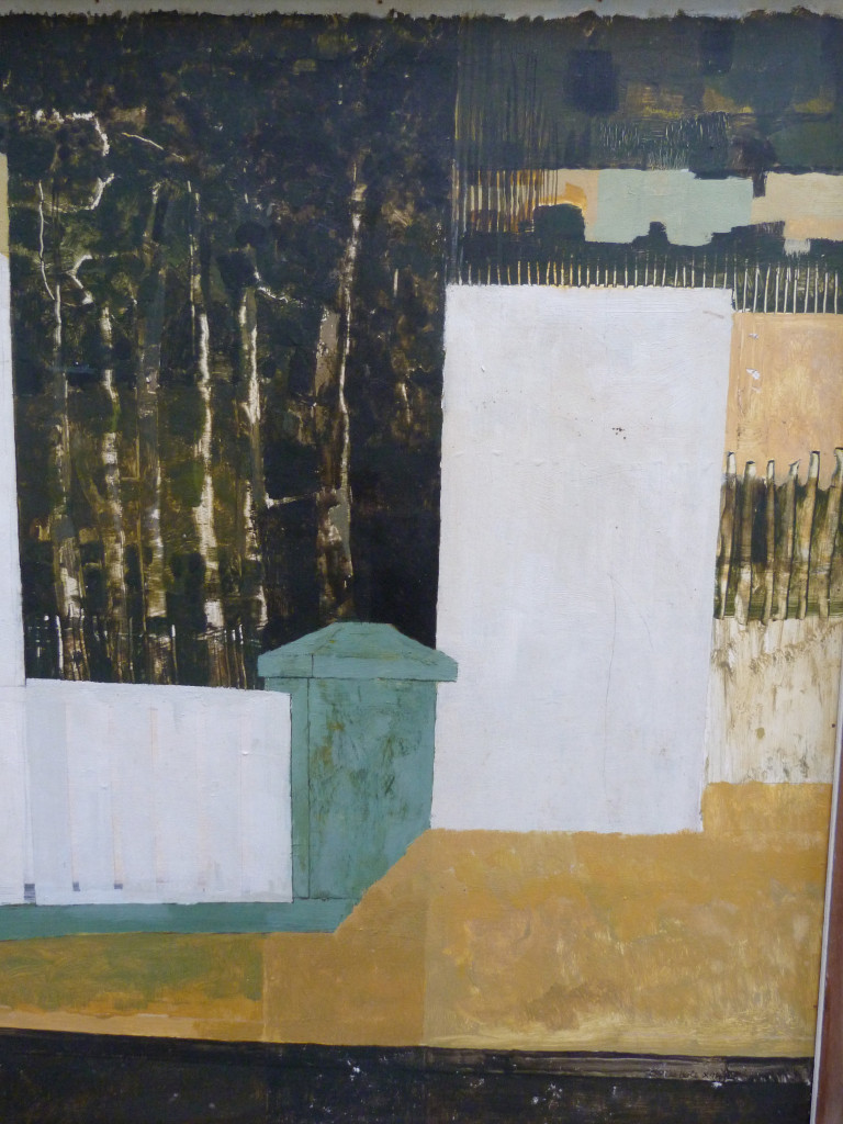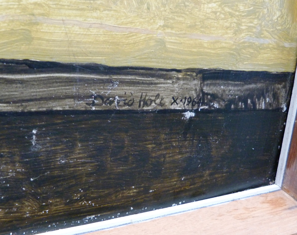 Painted in October 1964, this is a very large oil on board, framed (but not glazed). The frame measures 126 × 79cm, with a depth of 5cm. Signed and dated lower right, with David's pencil titling and signature to the back of the frame.