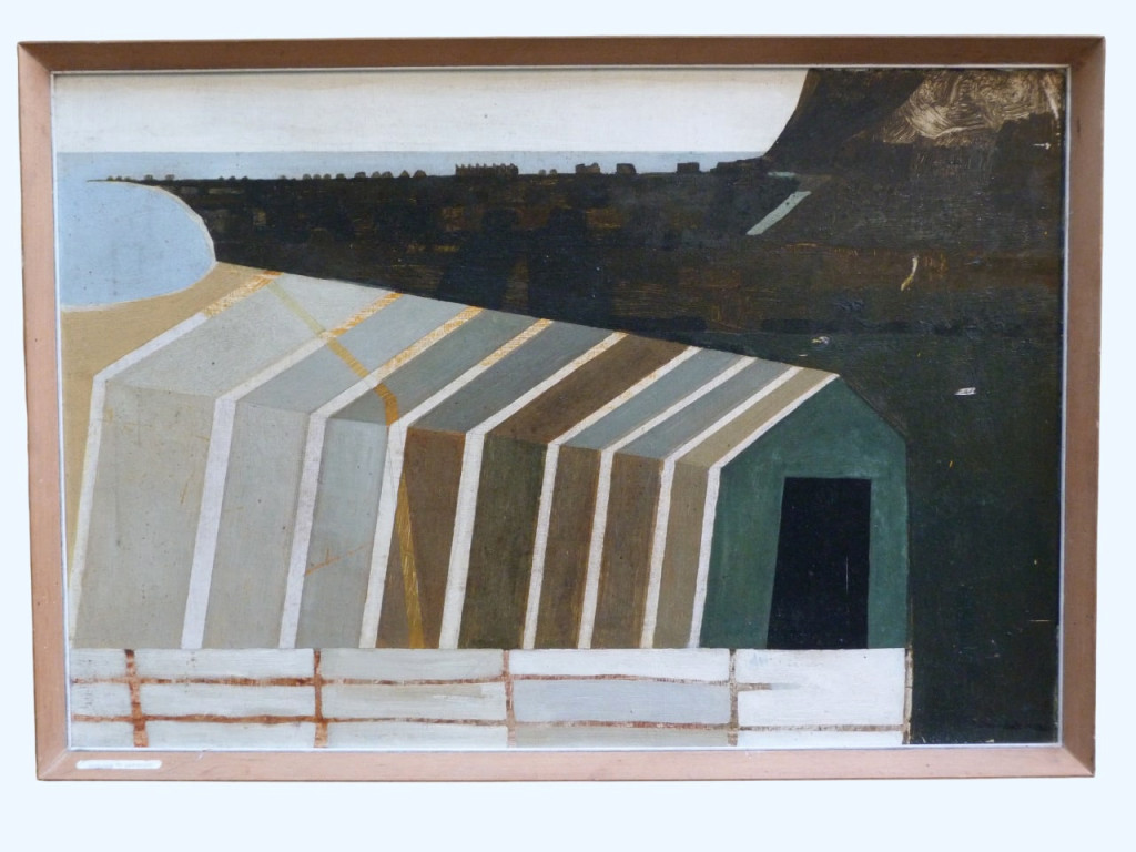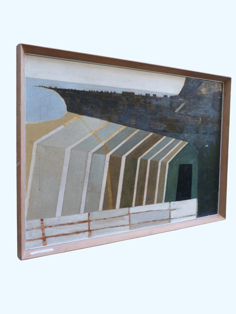 Good condition for age. There are two scuffs to the painting both about midway down to the right hand side, and some small surface marking and general age-related wear. The frame is in good solid condition. The whole remaining an impressive piece of original 1960s semi-abstract art.