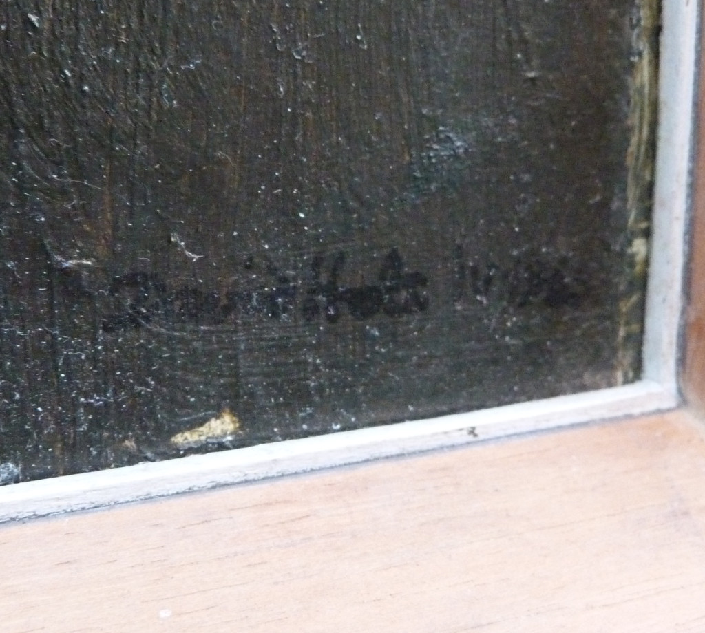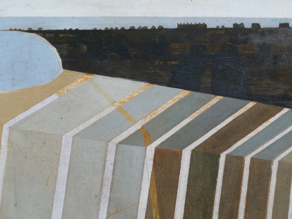 Painted in October 1964, this is a large oil on board, framed (but not glazed). The frame measures 73 × 50cm, and the painting measuring 69 × 47cm. Signed and dated lower right, typed label for exhibiting to frame (calling the painting Entrance to Landscape), and typed label to reverse (calling the painting Greenhouse).