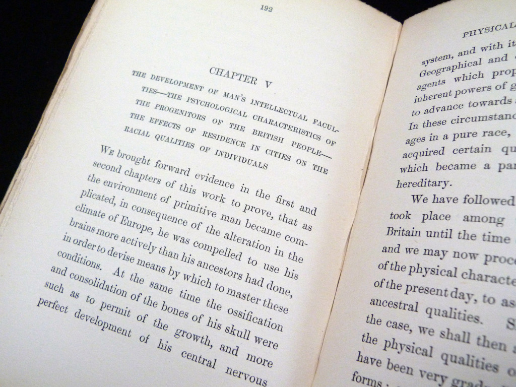 A study of the development of the British people primarily through the examination of their skulls, and illustrated with photographs. Chapters: 1. Palaeolithic Man: His Physical and Mental Development, 2. The Iberian and Aryan Pre-Historic People of Western Europe, 3. The Ancient Brachycephalic (Broad-Skulled) or Mongolian People of Europe, 4. The Racial Origin of the British People, 5. The Development of Man's Intellectual Faculties, the Psychological Characteristics of the Progenitors of the British People, the Effects of Residence in Cities on the Racial Qualities of Individuals.