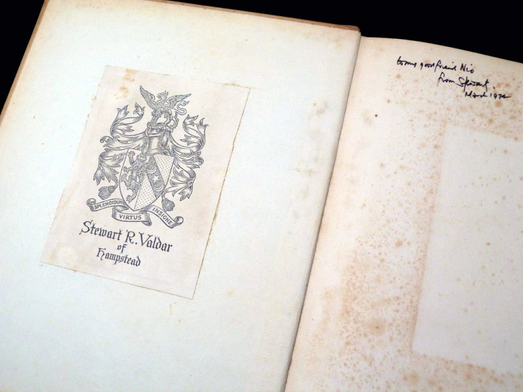 This copy carries the bookplate, signature and gift inscription of Stewart Valdar of Hampstead. Valdar (1917–2007), a Communist (later Labour) Party member and journalist, he edited the Hampstead News and the Marylebone Record as well as a sub-editor on the Daily Herald and Sunday Times. In his political campaigning, he never sought high office, preferring to be "a foot soldier of the revolution".