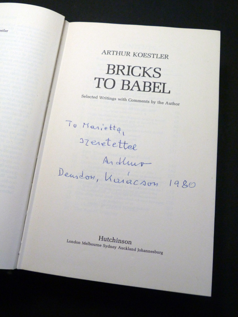 Signed and dedicated with a warm Hungarian greeting to the title page by Arthur Koestler (as Arthur), and dated 1980.