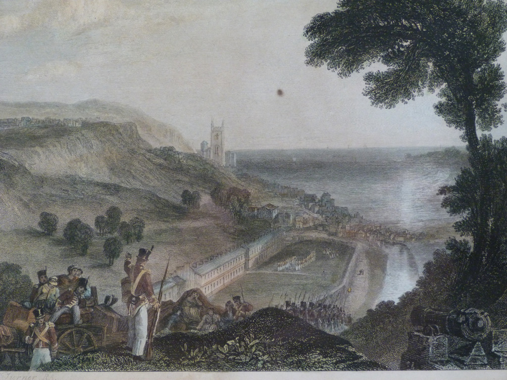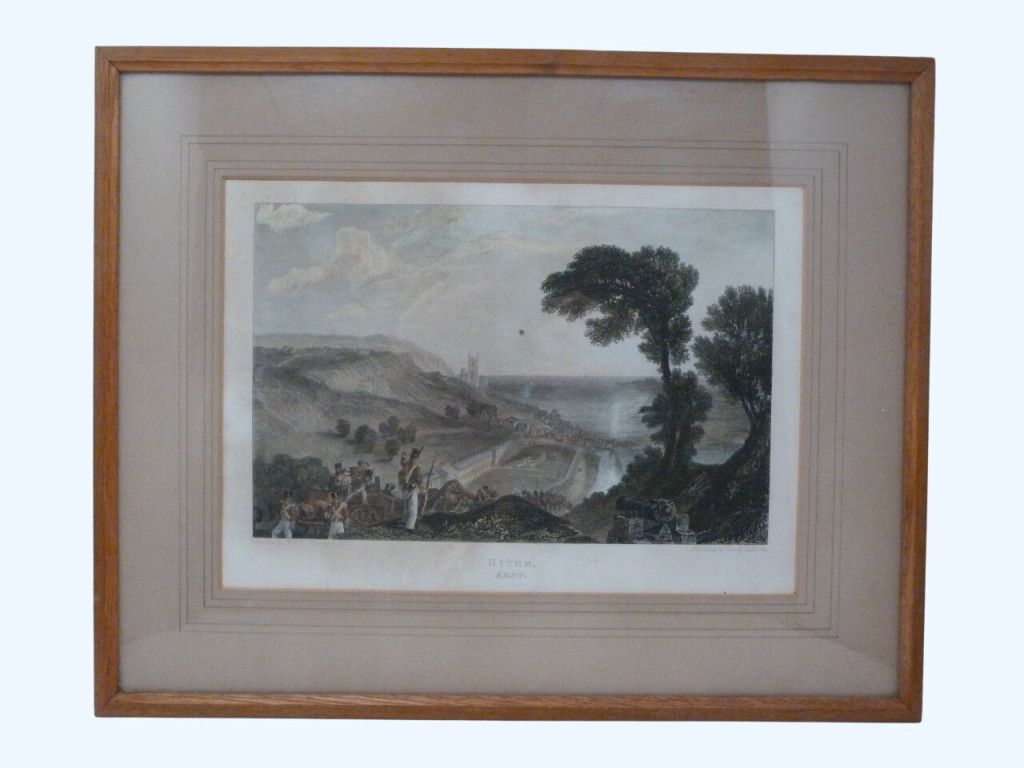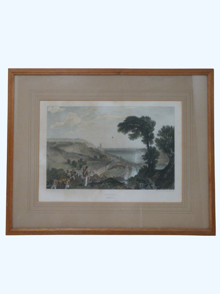 A beautifully preserved 1824 engraving of Hythe, Kent, hand-coloured in a sophisticated palette of ochres, soft greens, and maritime blues. This plate, engraved by the renowned George Cooke, was part of Turner’s landmark series Picturesque Views of the Southern Coast of England (1826), a project that cemented his reputation as the premier chronicler of the British landscape.