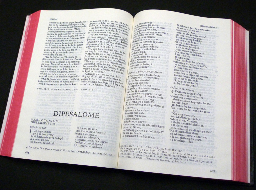 The Bible, containing the Old and New Testaments in Tswana, a Bantu language spoken in South Africa and the national language of Botswana.