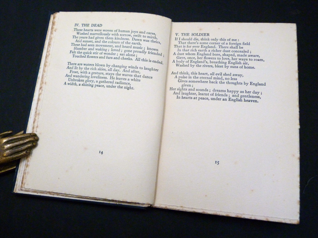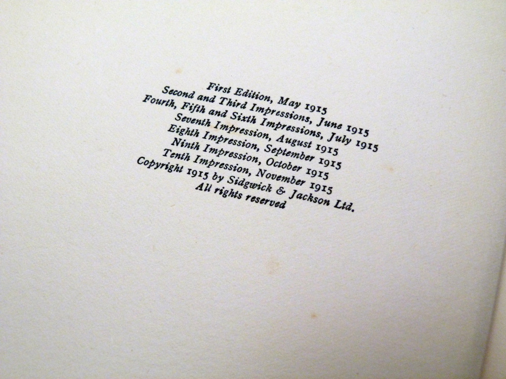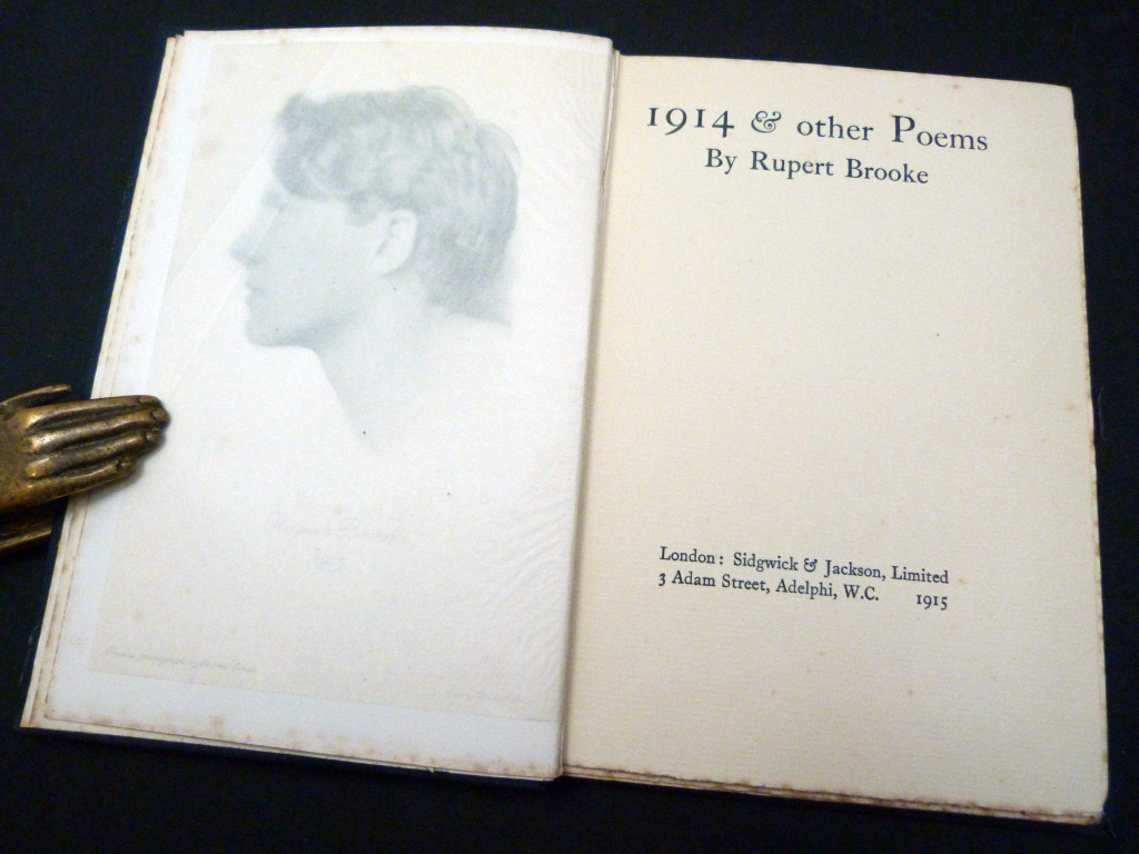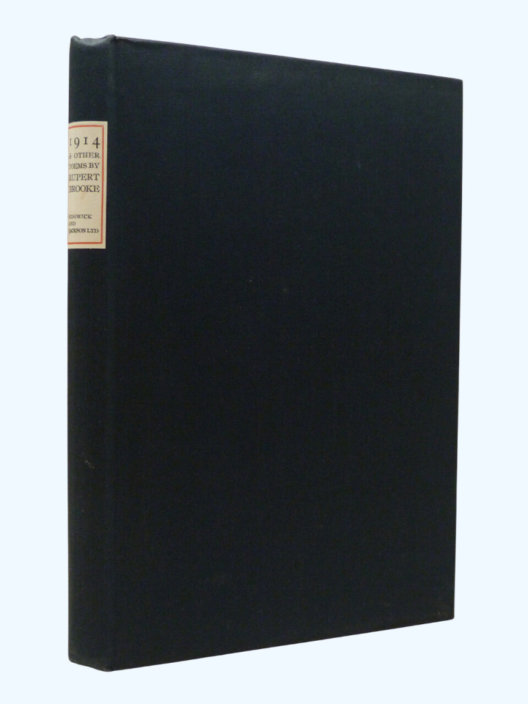This is an early edition of Robert Brooke's 1914 and Other Poems, printed at The Complete Press, West Norwood, and in the original dustwrapper. This title contains his famous five poems (including The Soldier—"If I should die...") written in the first autumn of the Great War and gained immense popularity when published in poetry journals of the time, and even more so when, a few weeks before his death, the Dean of St Paul's Cathedral read it at the Easter Sunday service. This is followed by The Treasure which acts as a preface to '1914'. The book also contains The South Seas, other poems, and The Old Vicarage, Grantchester. The book is illustrated with a tissue-guarded frontispiece of Sherril Schell's photograph of Brooke.