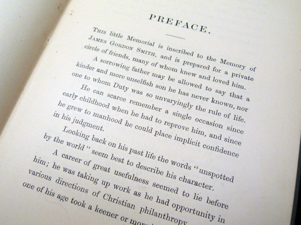 A privately printed In Memoriam book for James Gordon Smith, printed for his father, Samuel Smith MP. The book contains a preface, a sermon by the Rev George Johnstone titled The Incompleteness of Life (preached in Trinity Presbyterian Church, Prince's Park, 11th December 1898), an address at the Chapel of Toxteth Park, and a list of those present at the funeral.