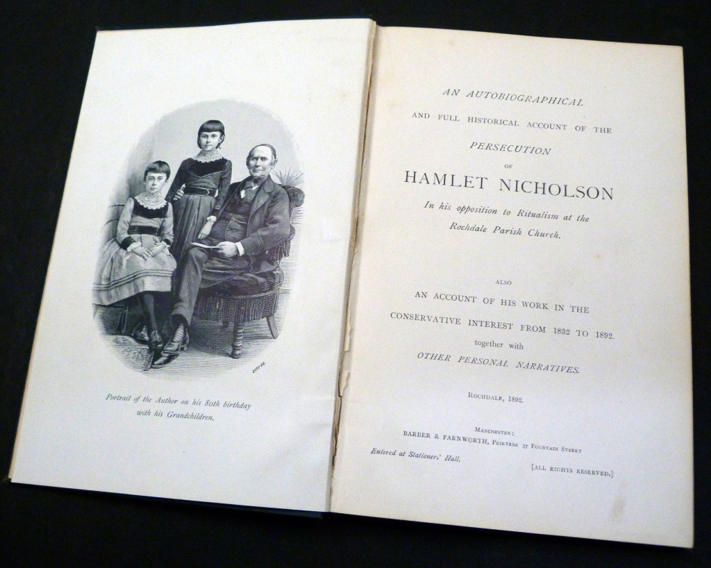 Full title: An Autobiographical and Full Historical Account of the Persecution of Hamlet Nicholson in his Opposition to Ritualism at the Rochdale Parish Church, also an Account of his Work in the Conservative Interest from 1832 to 1892, together with Other Personal Narratives.