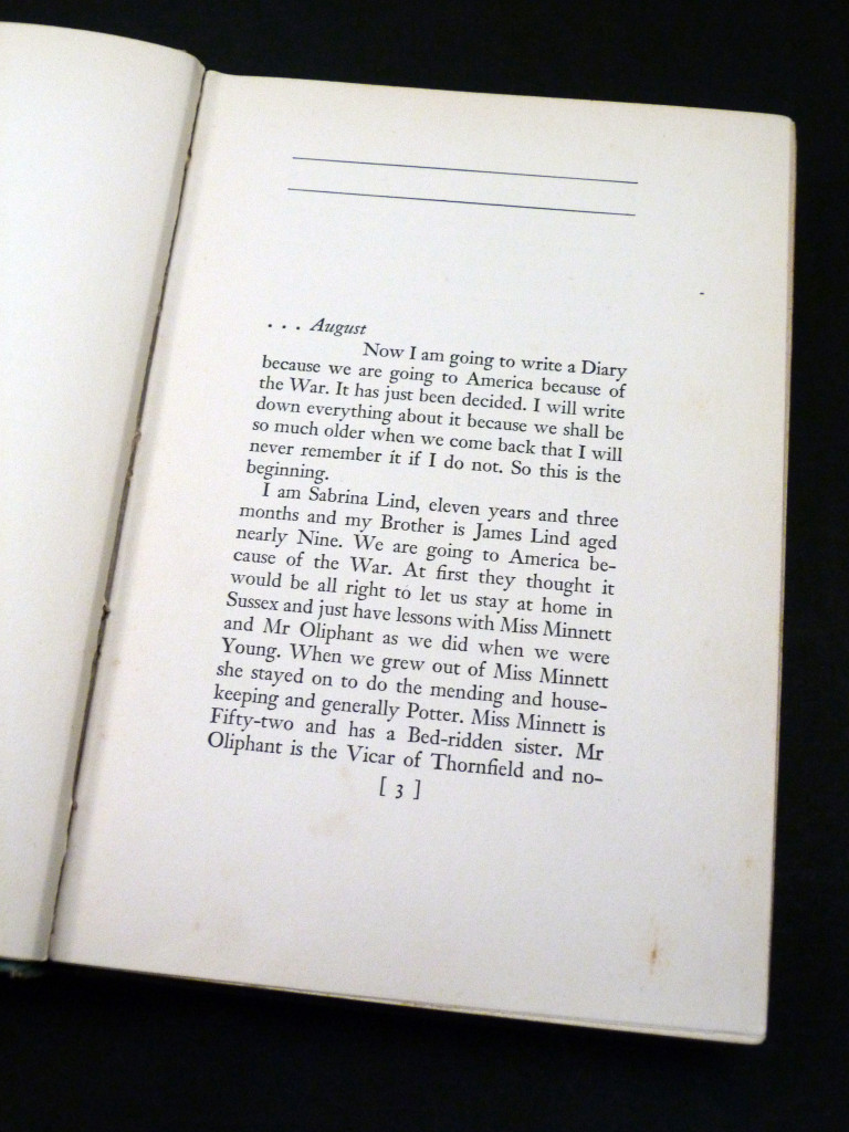 From the author of the Mary Poppins stories, this is the fictional diary of Sabrina Lind, an eleven-year-old English girl who, with her little brother James, is sent on the long voyage across the sea to her aunt in America. Colour frontispiece by Gertrude Hermes, and further black and white drawings throughout the book.