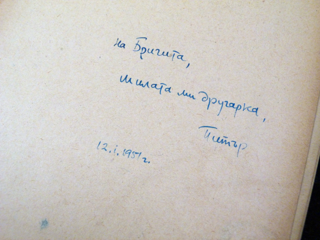 This copy has a previous owner's inscription to the ffep in Bulgarian which when translated reads "To Brigita, my dear friend, Peter, 1952". These were Brigita Yosifova, a Bulgarian author and journalist, and Peter Tempest, a British poet and translator. They went on to marry shortly afterwards.