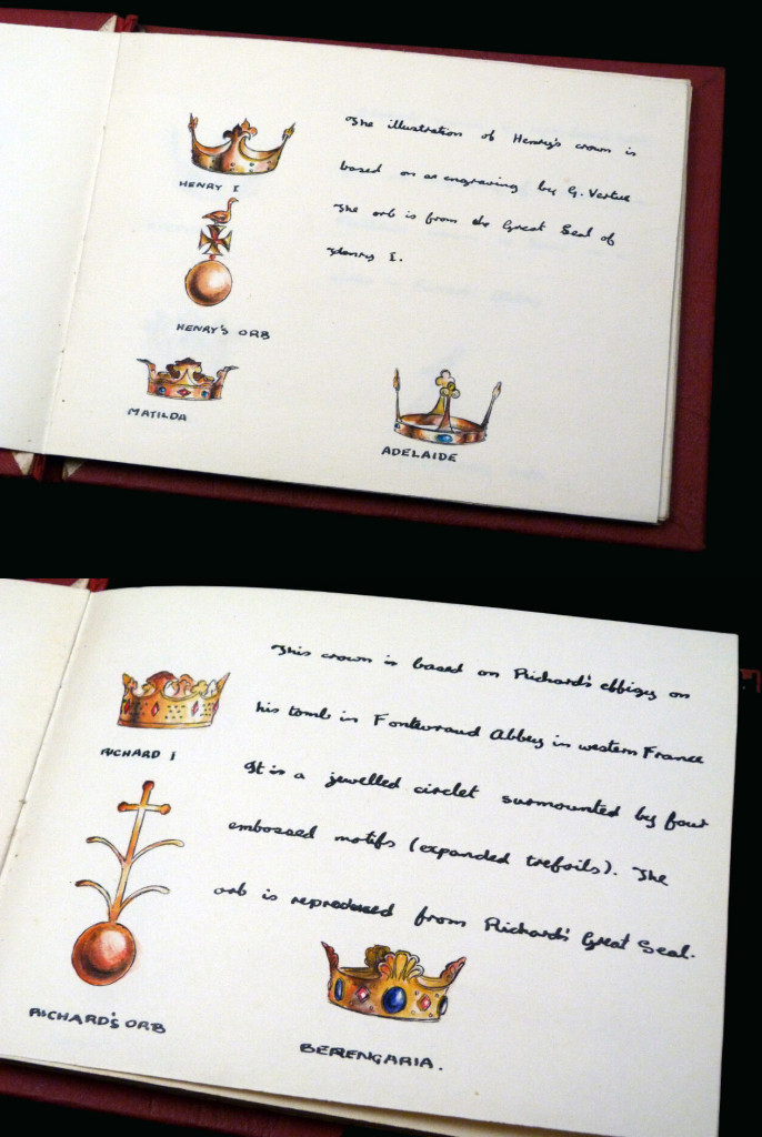 The book begins with the crown of William I and Matilda, with William's orb, through William II, Henry I, Stephen, Henry II, Richard I, Berengaria through to Queen Victoria. Then it moves on to Scottish royalty (the Scottish crown, sceptre and sword of state), then the cap of Monomakh of Russia, the Papal Triregnum and the Holy Roman Empire, Lombardy and Italy, Austria and Hungary, Bulgaria and Rumania, ending with Bohemia and Denmark with more in between. Finally there is a hand drawn map and a written list of the Kings and Queens of England (ending with Elizabeth II). Each page has 2 or three illustrations and most with a written description.