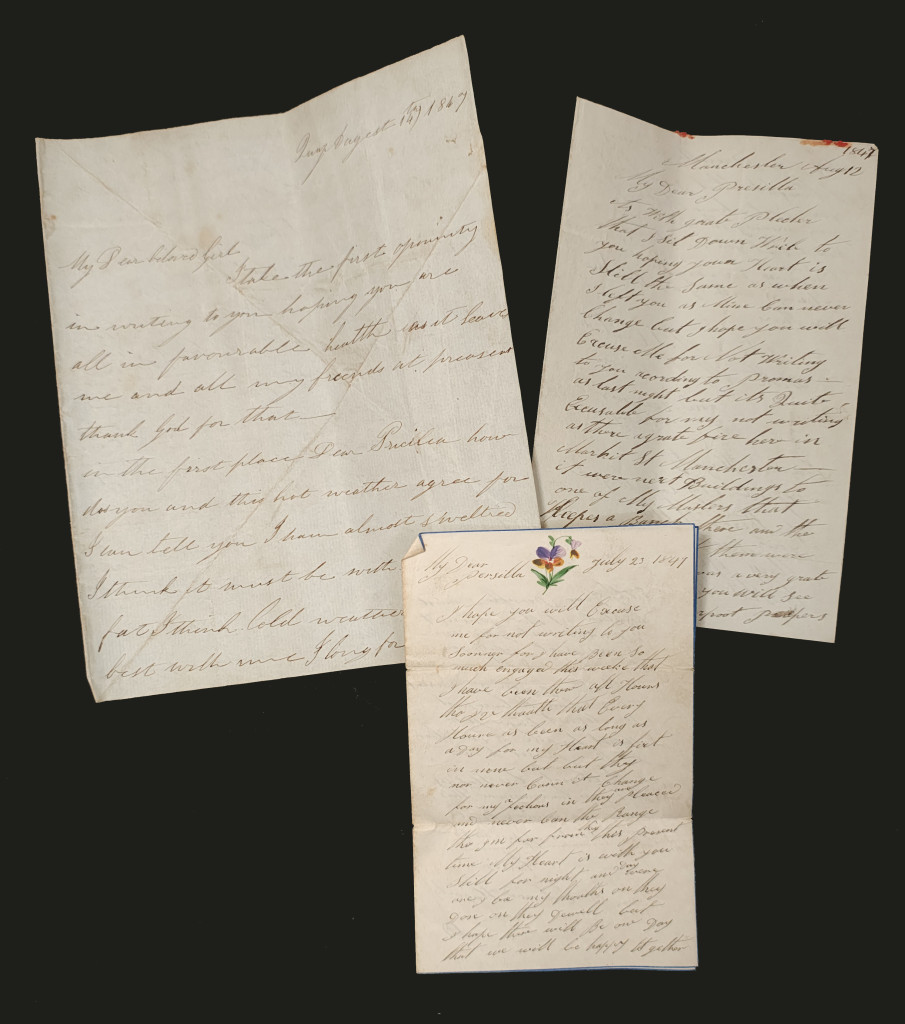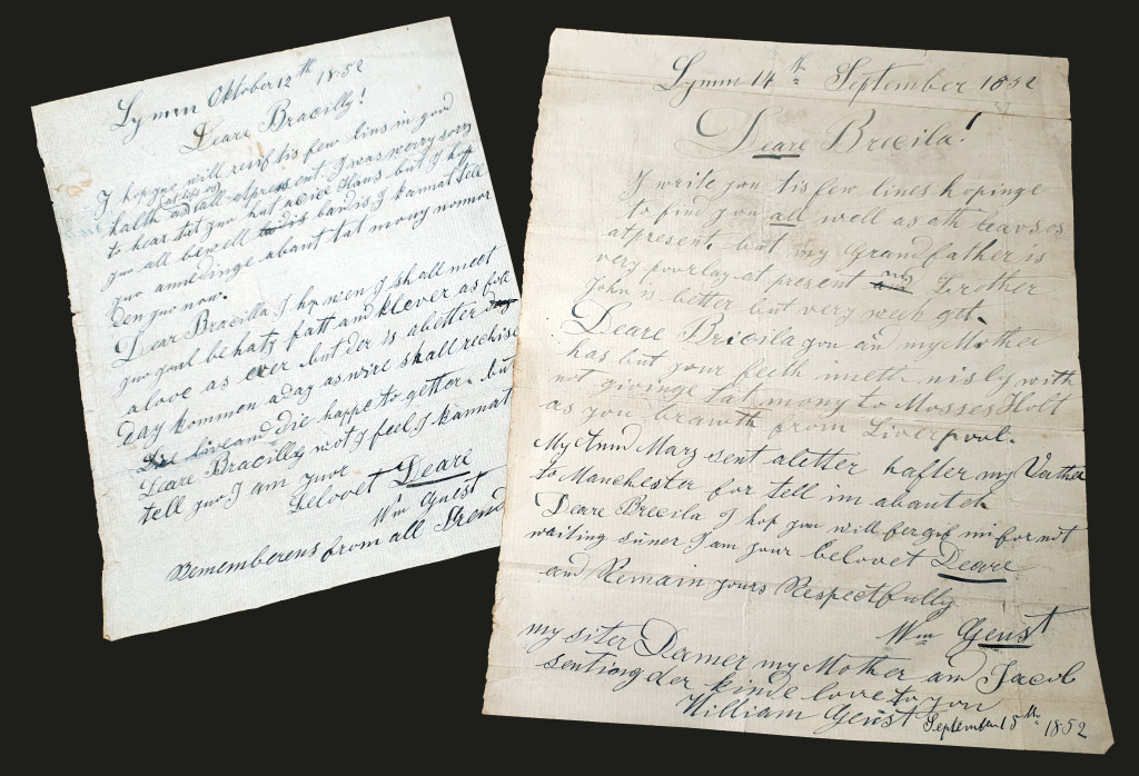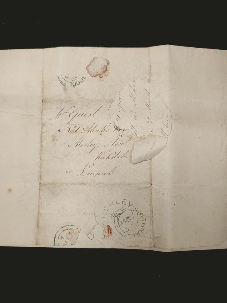 The letters were sent to and among the Guest family, they are mostly to Priscilla Guest, the eldest daughter who was born in 1829 and died in 1863. She was the daughter of William (1803–1873) and Esther (nee Brooker, 1803–1881). Priscilla had six brothers and sisters, only two of whom made to adulthood. She married William Wilding in 1853. The majority of the letters were sent to No 1 Alcock Buildings, Morley Street, Kirkdale nr Liverpool, an earlier address is 35 Portland Street, Vauxhall Rd, Liverpool, and most are a single sheet of paper, the correspondence on one side, and in some cases the address, postmark and occasionally, the remains of a seal to the other side.