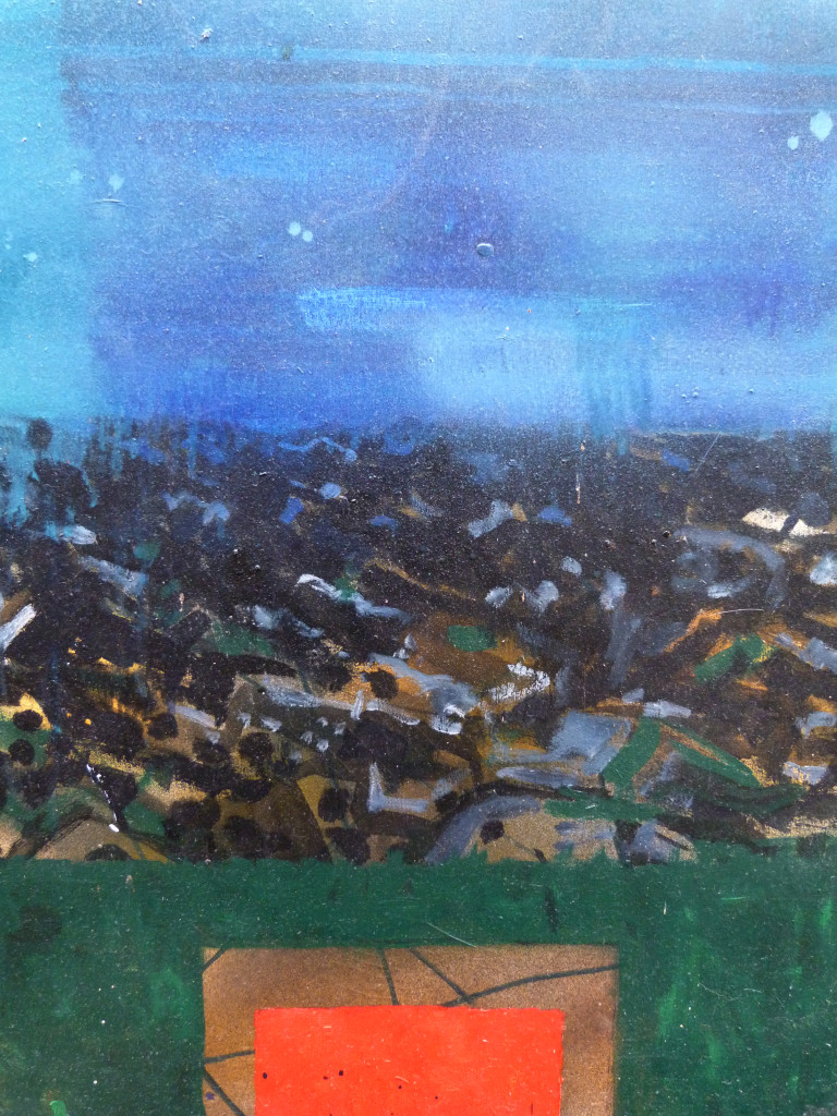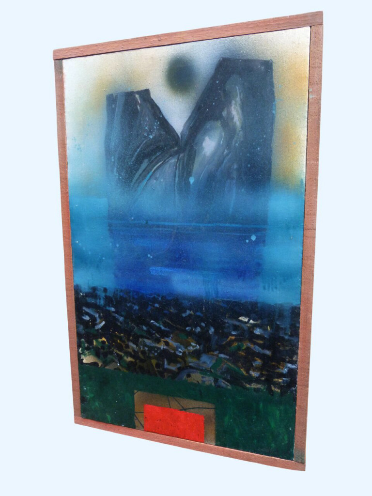 Painted in October 1991, this is an oil on canvas in a handmade frame (it is not glazed). The frame is constructed from rough wood with a slight red colouring to the facing side. The whole measures 96 × 60cm, the frame has a width of 2cm, × 4.5cm.