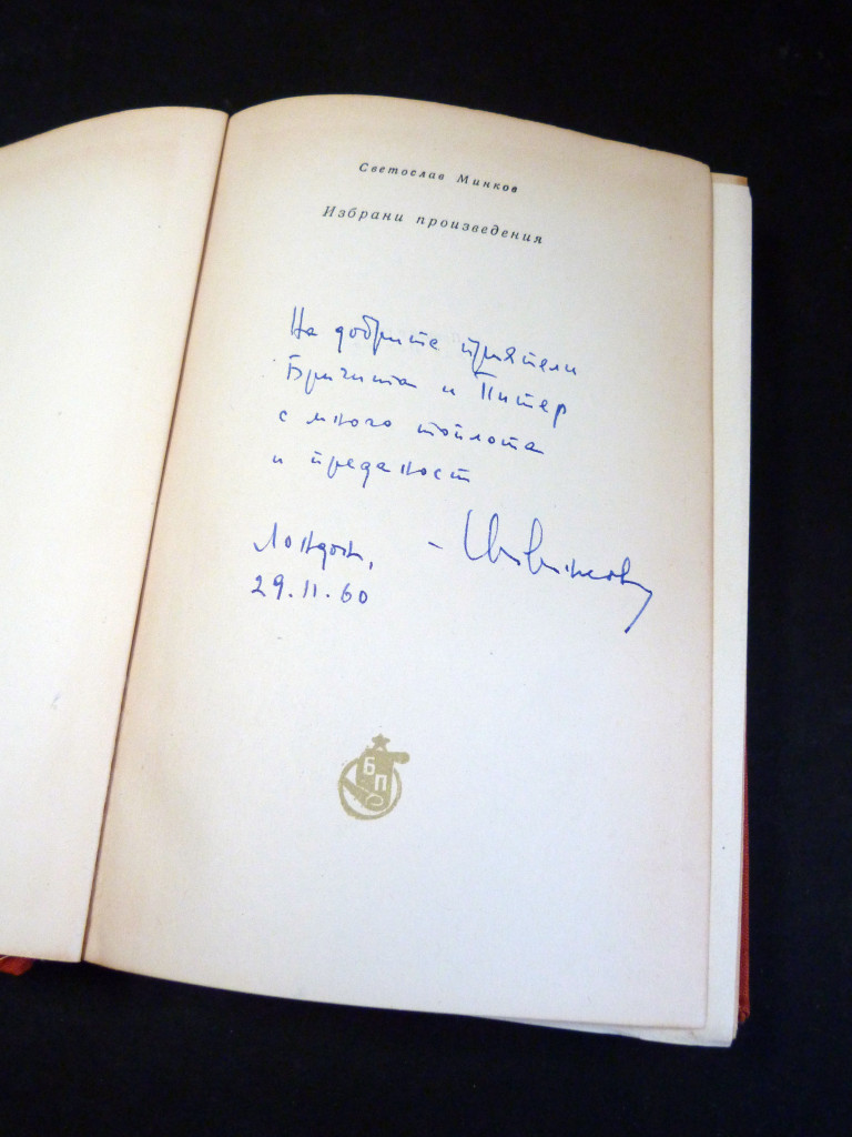 Signed and dedicated by Svetoslav Minkov to the half title page in Bulgarian, it translates as "To good friends Brigitte and Peter with much warmth and devotion – Sv. Minkov, London, 29.11.60". The recipients were Brigita Yosifova, a Bulgarian author and journalist, and Peter Tempest, a British poet and translator.