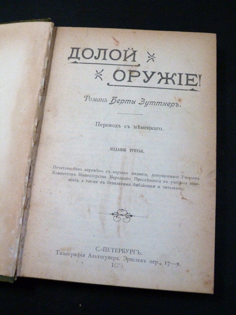 1. Lay Down Your Arms! by Bertha von Suttner, published by Altshuler, St Petersburg, 1905. Third Russian edition, 93pp. Von Suttner's classic anti-war novel first published in Germany in 1889 as Die Waffen nieder! An interesting edition as published in the same year that von Suttner was awarded the Nobel Peace Prize, with this issue stating the text had been "approved by the Scientific Committee of the Ministry for Public Education". The text is complete and in strong readable condition.