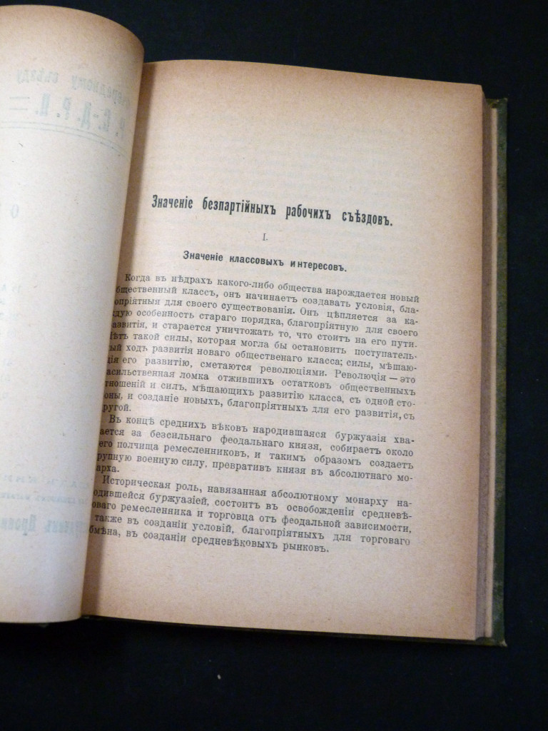 2. On the All-Russian Workers' Congress, published by Provincial Colleague (Sotrudnik provintsii), Moscow in 1907, and containing a collection of articles (sbornik) from the Russian Social Democratic Labour Party (the R.S.D.R.P.). An important piece in this sammelband as it is a rare survival. The contents in this are : (i) Aleksandr Arkhangelsky, The Significance of Non-Partisan Workers' Congresses (in France and Germany), (End of November 1906), pp3–47, analysing workers' congresses in Western Europe, arguing that this strengthens their Socialism. Good readable condition but with a small hole (1.5 × 1cm) to the centre of the page, possibly a production error as the angle of text is skewiff. (ii) El (pseudonym of L S Yezhov / Ezhov, born L S Tsederbaum, brother of Julius Martov and Lydia Day, both prominent Mensheviks), The All-Russian Workers' Congress (November 1906), pp49–88. A key part of the Mensheviks' ideology of a broader, democratic, and legalistic party, as opposed to the Bolsheviks' centralized, exclusive party of professional revolutionaries committed to immediate, violent socialist revolution. Lazar Solomonovich Yezhov (1874–1940) was a prominent Menshevik, and key proponent of the "Workers' Congress", his work here explores the connection between the Workers' Congress and the objective conditions of the class struggle in in Russia. He is known to have used El as a pseudonym to avoid arrest (as per the Russian National Library) and was frequently attacked by Lenin in his writings as a Menshevik Liquidator. (iii) Akhmet Ts-ov (Akhmed Tsalikov), Petty-Bourgeois Elements in the S-D Party and the Workers' Congress (October 1906), pp89–118. A warning that the party is being swamped by petty-bourgeois elements, and the need for a non-party congress to cleanse the movement of outside influences. (iv) The three main sections are followed by a five-point summary of Menshevik Resolutions (pp119–122), an editorial note (pp123–125), a one page list of brochures and articles focusing on the Workers' Congress, and serves as a bibliographical who's who in the Menshevik intellectual circle of the time, a contents page, and an advertisement for Yuri Larin's A Broad Labour Party and a Labour Congress to be published by Novyy Mir (New World) in St Petersburg and Moscow.