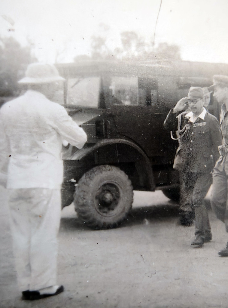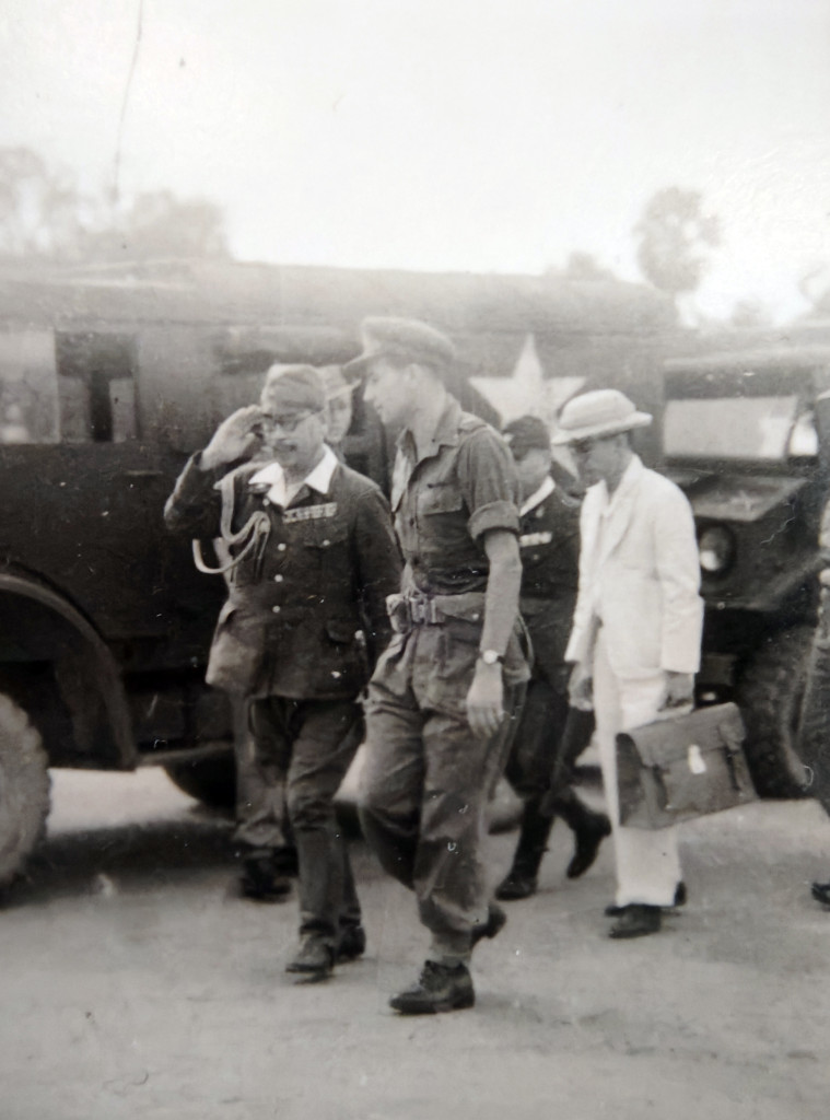 The Japanese officer in salute is Lieutenant-General Takazo Numata, Chief of Staff of the Southern Army. He was the personal representative of Field Marshal Count Terauchi, who was too ill to attend and was a lead delegate sent to Rangoon to arrange the local surrender of Japanese forces in Southeast Asia. Rear Admiral Kaigun Chujo Chudo, the senior Naval representative for the Southern Force can be seen walking next to the gentleman in the white suit.