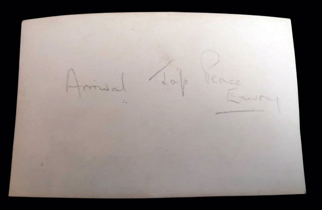 This is an original snapshot of the Japanese Peace Envoy arriving at Mingaladon Airfield in Rangoon (Yangon), Burma, around August 26–27, 1945. It is a small candid photograph, measuring 11.5 × 7cm. "Arrival Jap Peace Envoy" is written in pencil to the reverse.