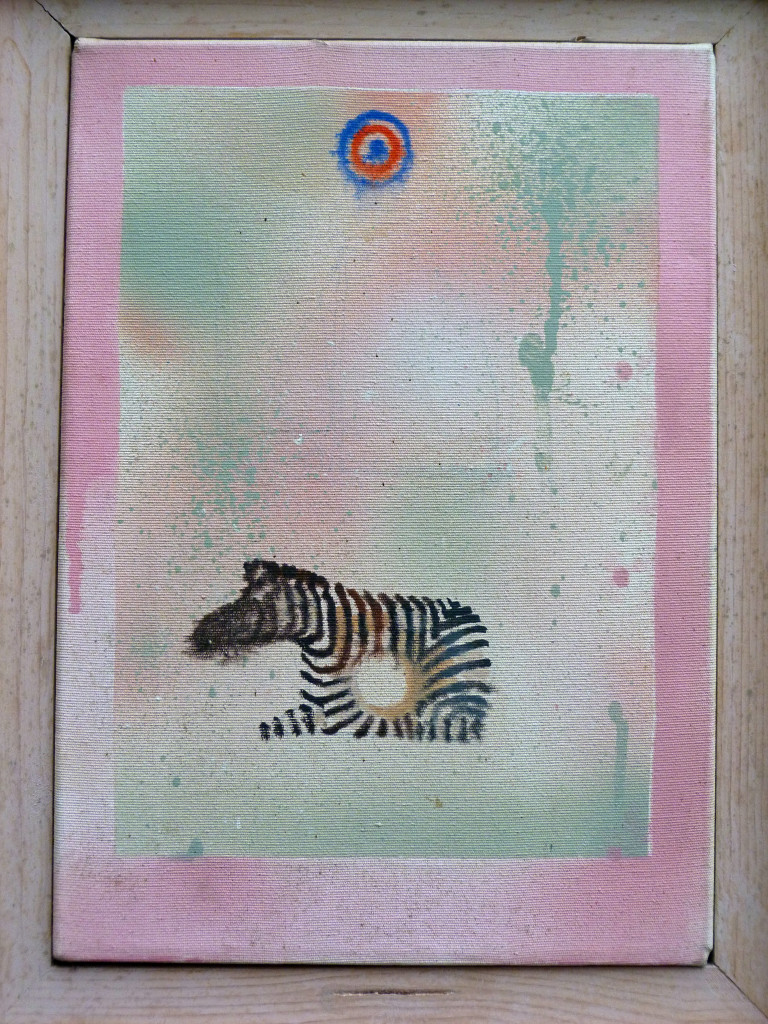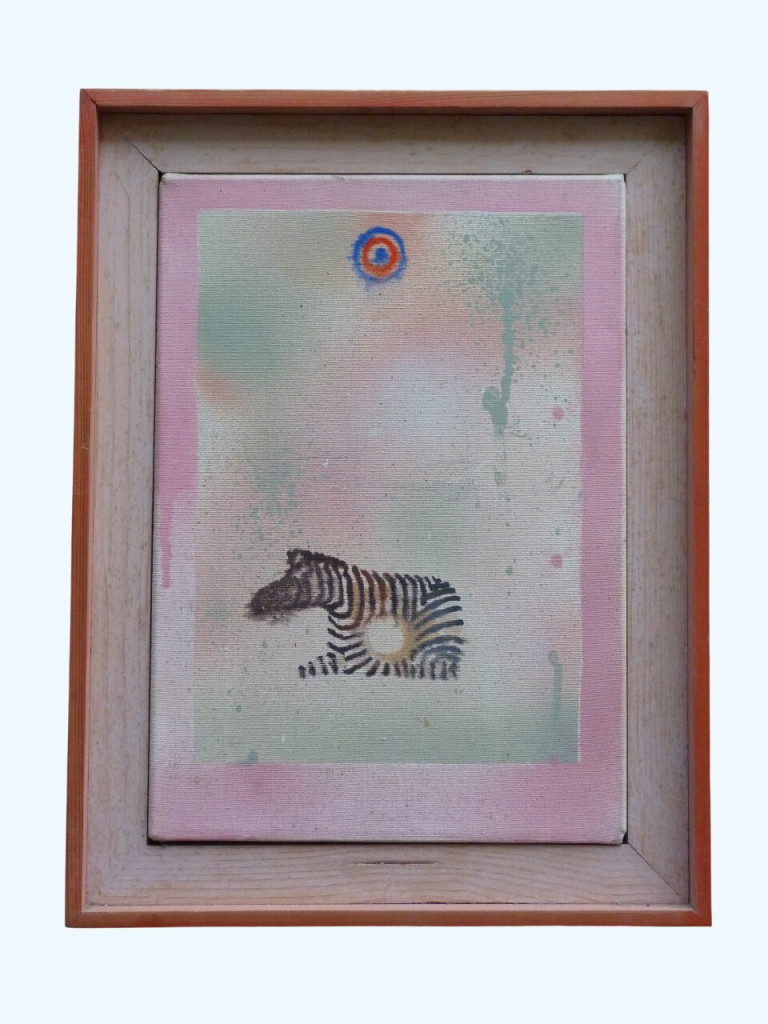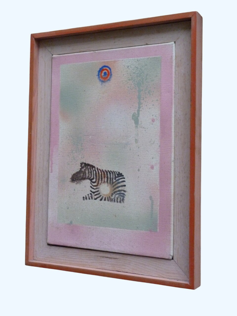 A vibrant, semi-abstract composition by David Holt, featuring the stylized form of a zebra set against a luminous pastel backdrop. To the upper register, a bold red and blue roundel adds a geometric focal point, while the faint, ethereal outline of a sailing boat drifts between the central figure and the motif. The canvas is finished with a hand-painted pink border, utilizing a distinctive blowpipe technique that lends a soft, diffused texture to the work—an experimental touch that extends slightly onto the inner frame, integrating the artwork with its housing.