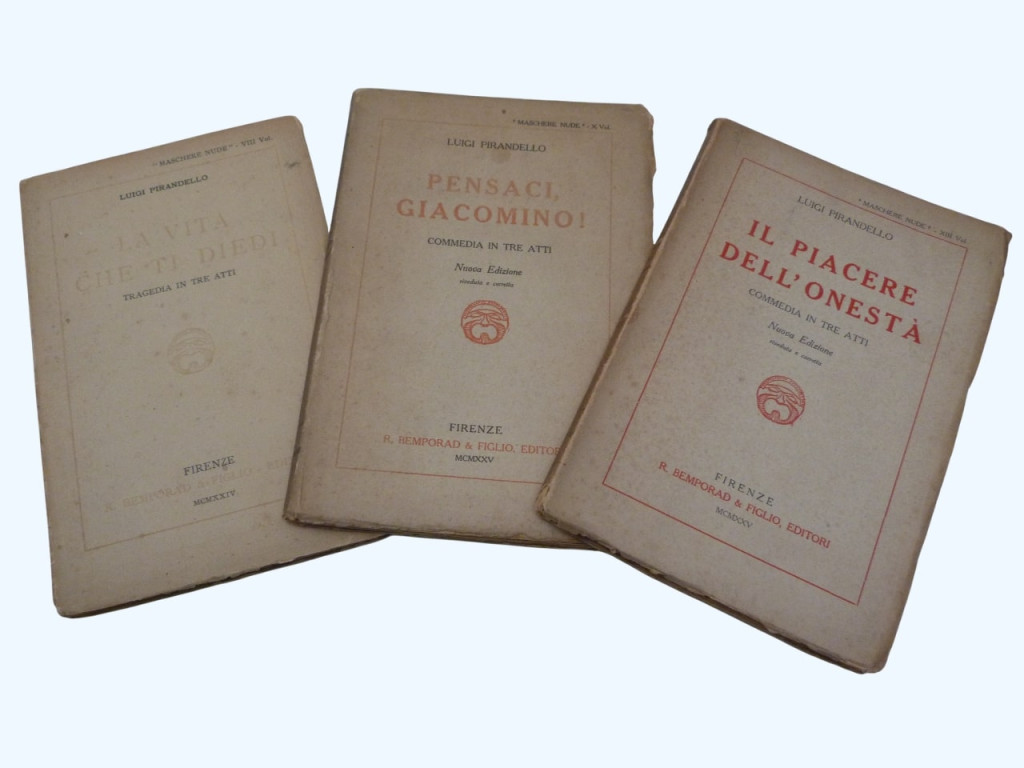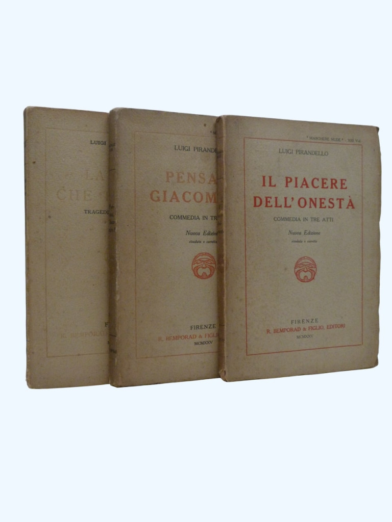 Three early 20th-century editions of plays by Luigi Pirandello, one of the most influential playwrights of the modern era. These specific volumes were published in Florence by Bemporad & Figlio between 1924 and 1925. They are paperback editions, each 19.5 × 13cm. Italian text.