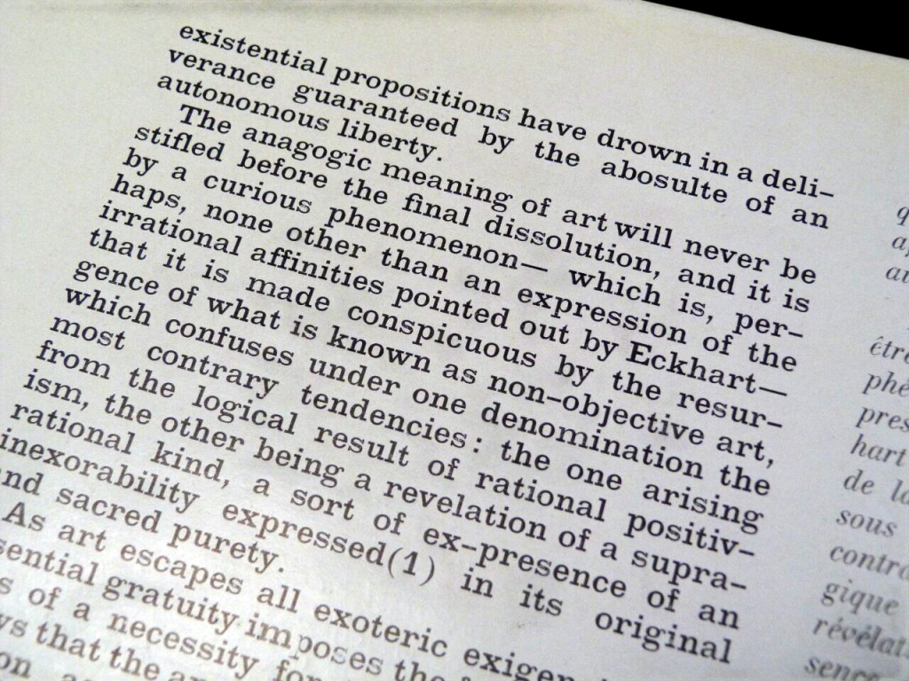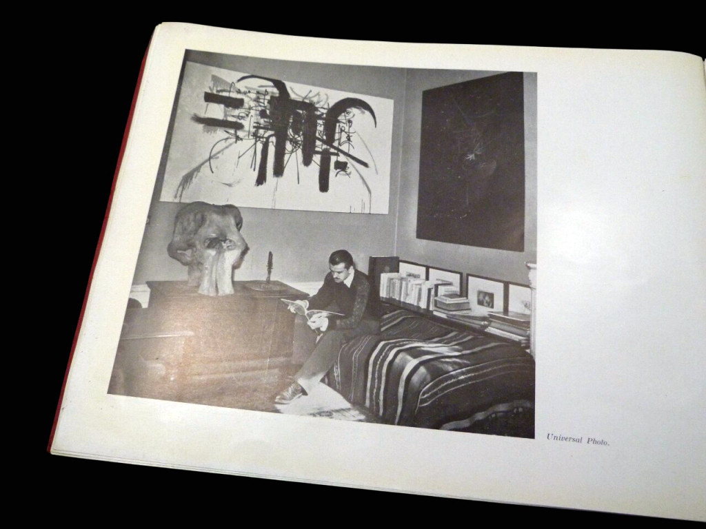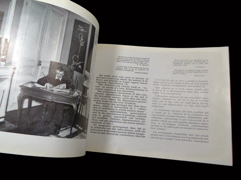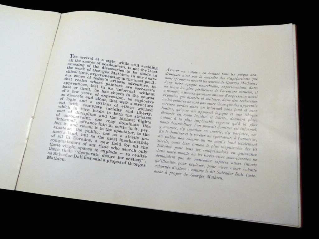 This is a book issued for Georges Mathieu's first solo US exhibition at Alexander Iolas Gallery in New York, having previously been at Studio Facchetti in Paris. It is formed of two essays, the first being Michel Tapié's The Significant Message of Georges Mathieu, in which he describes Mathieu's work without a traditional predefined logic or structure but more an informal adventure with "implacable rigour", and that the artist has reached a state of "complete lucidity" where he can dominate a canvas with total freedom. The second essay is Georges Mathieu's 'Anagogy of Non-Figuration' which is a more theoretical and psychological defence of his process, which he calls "anti-pictorial". He argues his art is far removed from the Western traditional concepts of painting and rejects idea of copying or interpreting from nature, instead he focuses on the 'inexorable desire to transmit a message". To Mathieu, the act of painting is a physical discharge of energy rather than a slow, calculated composition. The book is illustrated with two photographs of Mathieu and two of his work.