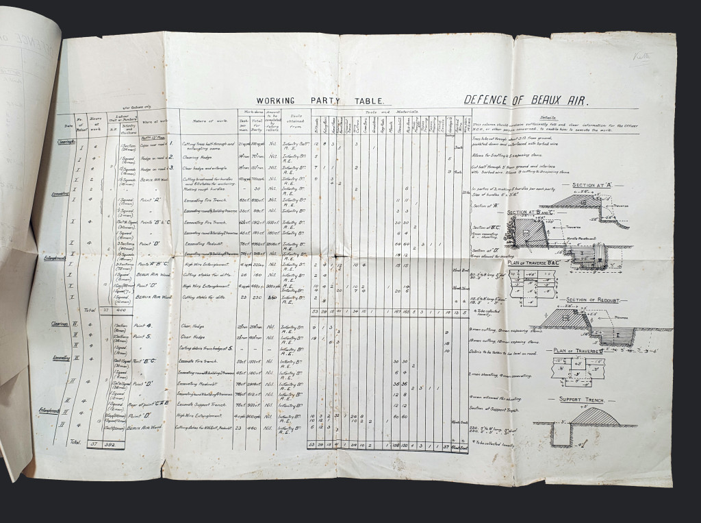 Estimate of Labour (Map 2): This is a technical spreadsheet. It calculates the man-hours required to dig the trenches. It includes cross-section diagrams of fire trenches and support trenches, showing exactly how deep and wide they must be to protect a soldier from shrapnel.