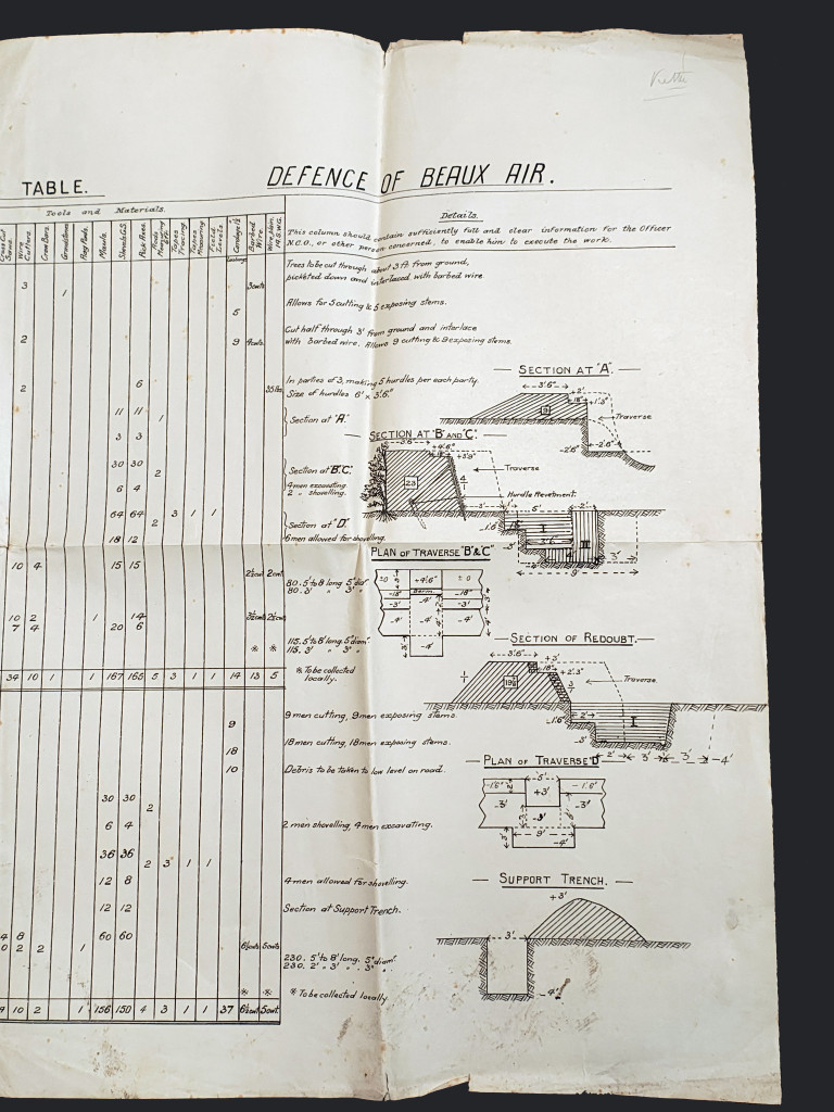 It is formed of three sheets, the largest being 75 × 50cm, the smallest being 50 × 48cm, and they are pinned together to the left hand side. On the reverse is written "Defence of Beaux Air", and "Scheme given to Officers RG & SR + T at Chatham during May 1913". The sheets show: