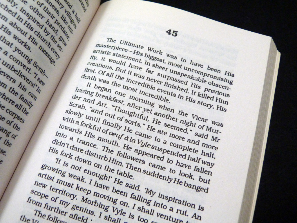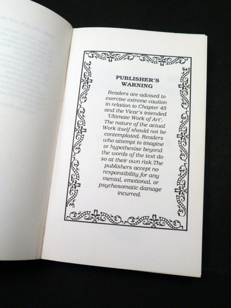 The book is famous for a meta-fictional "Publisher's Warning" regarding Chapter 45, which describes the Vicar's "Ultimate Work of Art." It reads "Readers are advised to exercise extreme caution in relation to Chapter 45 and the Vicar's intended 'Ultimate Work of Art'. The nature of the actual Work should not be contemplated. Readers who attempt to imagine or hypothesise beyond the words of the text do so at their own risk. The publishers accept no responsibility for any mental, emotional, or psychosomatic damage incurred".