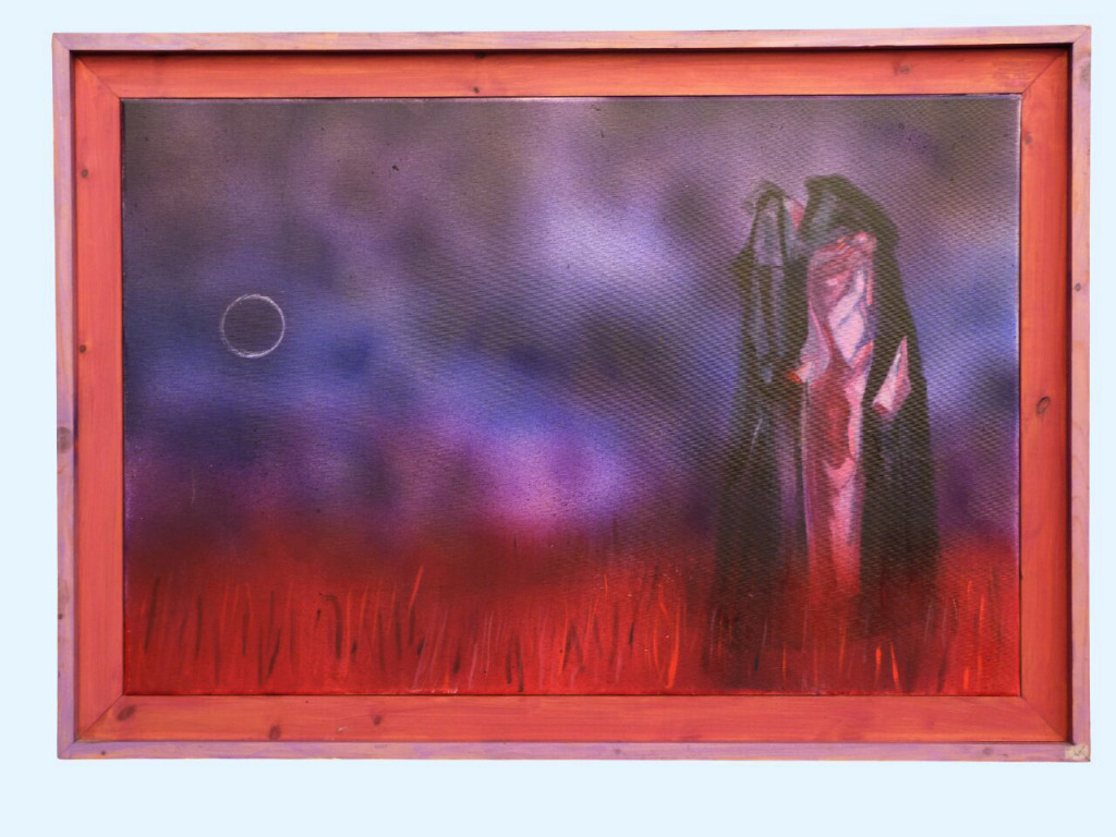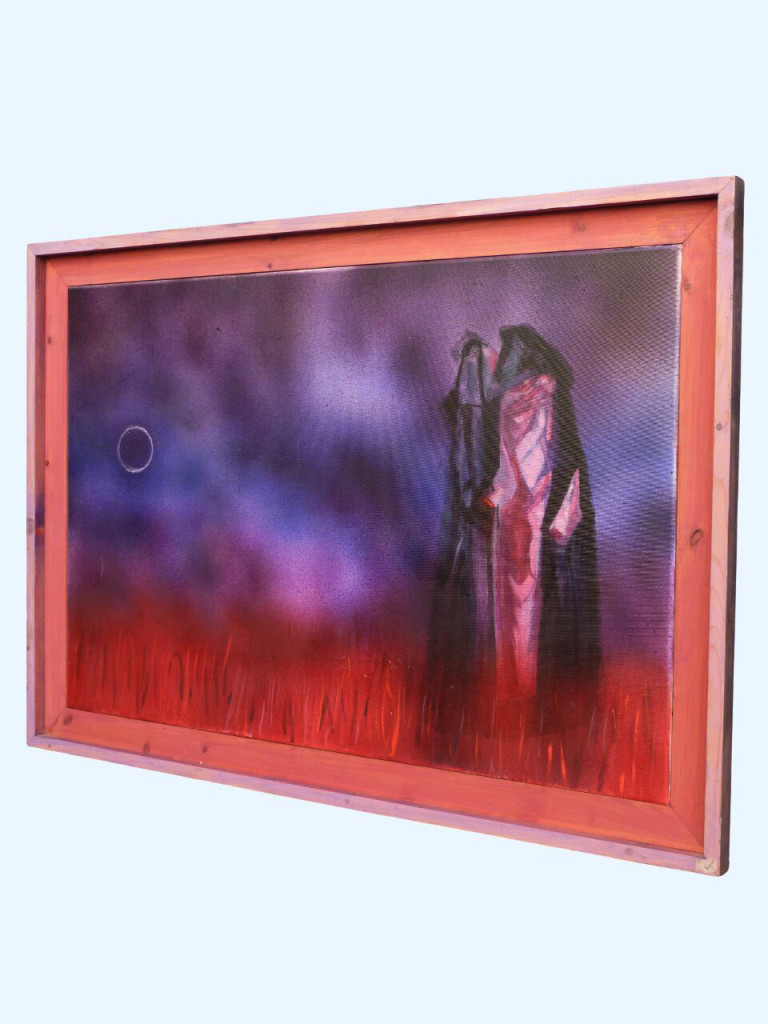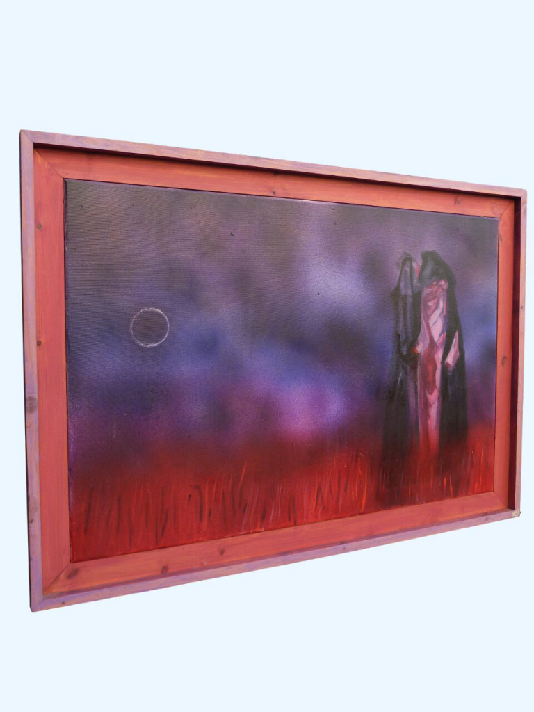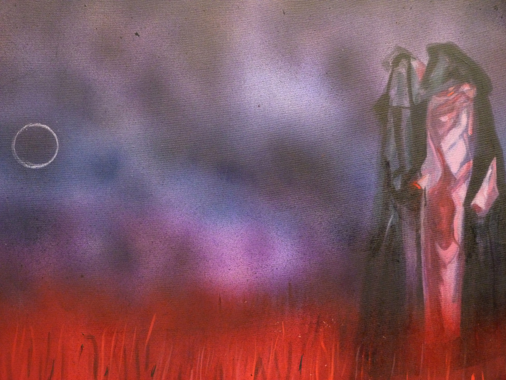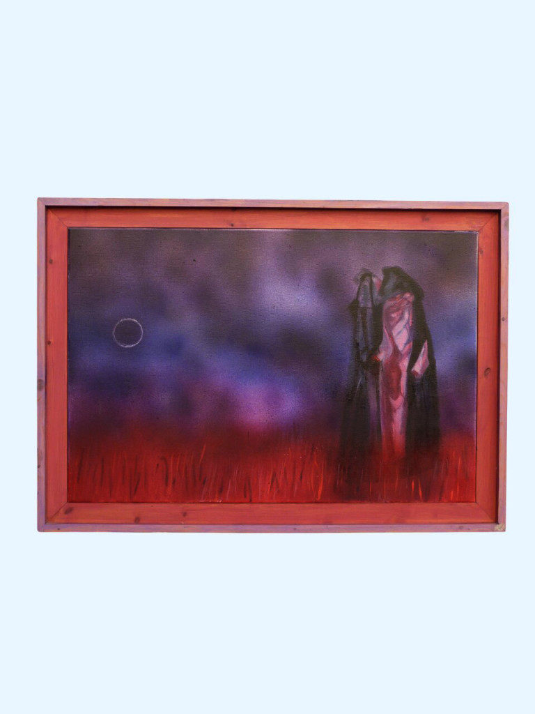 In this evocative work, David presents two monumental, shrouded figures locked in a dialogue that seems to vibrate through the very atmosphere. Rendered in a bruised palette of indigo and violet, the sky is punctuated by a singular, hollow celestial ring. Below, a thicket of fiery, vertical crimson strokes creates a restless, terrestrial heat.