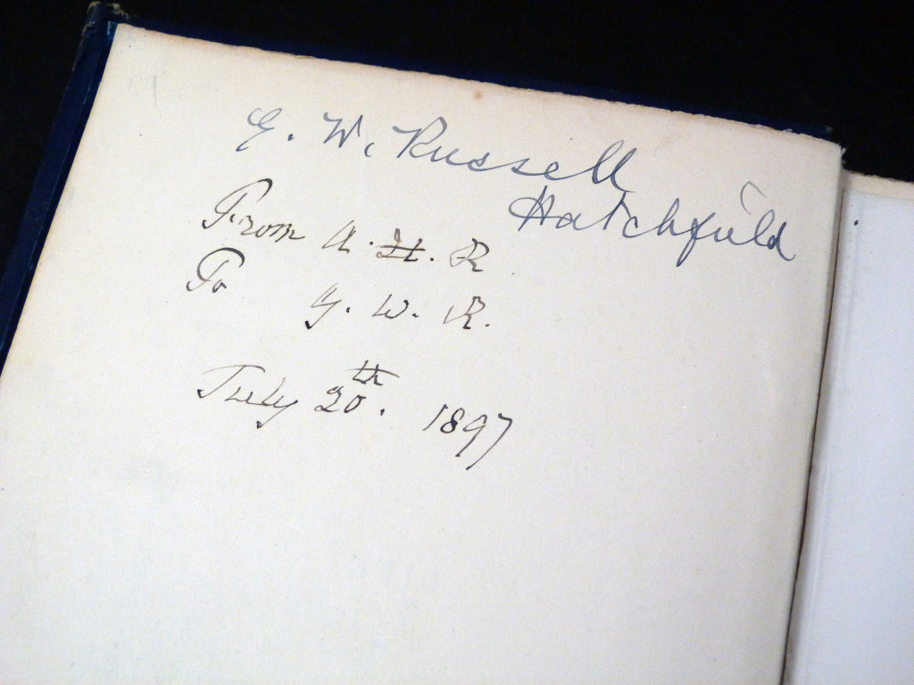 This copy was given to Admiral Gerald Walter Russell (1850–1928) by his father Andrew Hamilton Russell, with the father's inscription dated July 29th 1897. G W Russell has signed his name above that. Russell served in the Navy from being cadet in 1864 through to Captain-Superintendent of Pembroke Dockyard (1902–1904), retiring as Admiral in 1912. His father was a British Army officer who served on the legislative council in New Zealand and was Minister of Native Affairs.