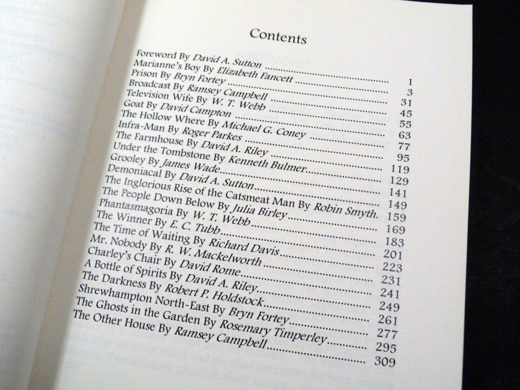 1. Marianne’s Boy By Elizabeth Fancett, 2. Prison By Bryn Fortey, 3. Broadcast By Ramsey Campbell, 4. Television Wife By W. T. Webb, 5. Goat By David Campton, 6. The Hollow Where By Michael G. Coney, 7. Infra-Man By Roger Parkes, 8. The Farmhouse By David A. Riley, 9. Under the Tombstone By Kenneth Bulmer, 10. Grooley By James Wade, 11. Demoniacal By David A. Sutton, 12. The Inglorious Rise of the Catsmeat Man By Robin Smyth, 13. The People Down Below By Julia Birley, 14. Phantasmagoria By W. T. Webb, 15. The Winner By E. C. Tubb, 16. The Time of Waiting By Richard Davis, 17. Mr. Nobody By R. W. Mackelworth, 18. Charley’s Chair By David Rome, 19. A Bottle of Spirits By David A. Riley, 20. The Darkness By Robert P. Holdstock, 21. Shrewhampton North-East By Bryn Fortey, 22. The Ghosts in the Garden By Rosemary Timperley, 23. The Other House By Ramsey Campbell.