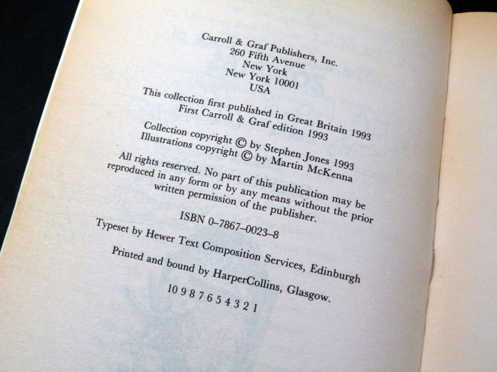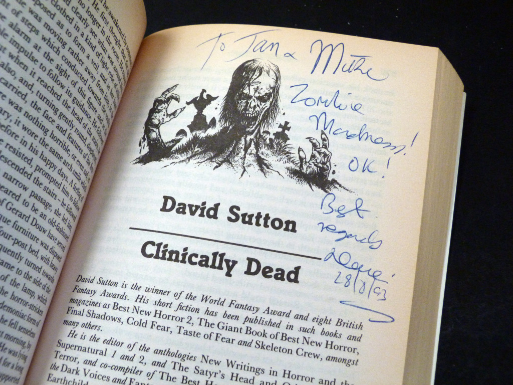Signed by the editor and three contributors: Stephen Jones has signed and dedicated the title page "For Jan + Mike, from the Head Zombie himself! Lotsa Love, from the Dead on his Feet—Stephen, 8/93". And then to the start of their stories, Ronald Chetwynd-Hayes, Brian Lumley, and David Sutton have signed and dedicated.