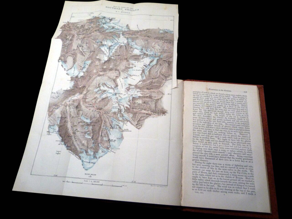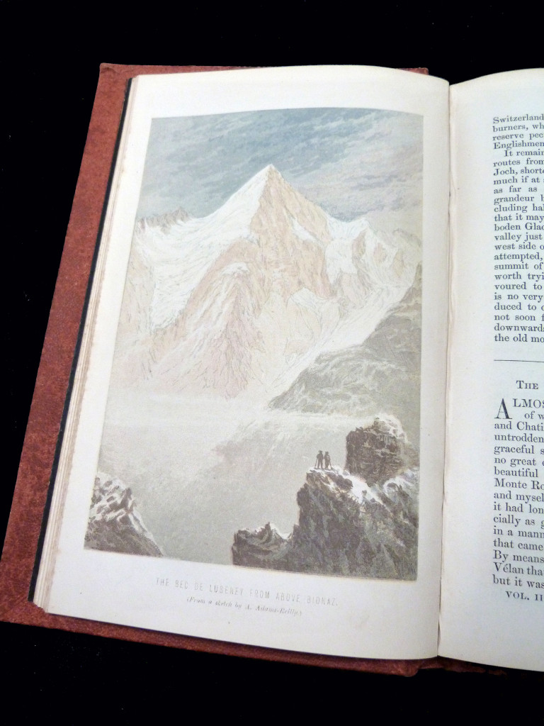 The book is illustrated with two fold out maps: sketch map of the Sierra Nevada and a map of Southern Graians, a frontispiece of The Sierra Nevada from the Torre de la Vela in the Alhambra, three colour plates: The Bee de Luseney, from above Bionaz; Raftesund Loffoden; and Lama Yuru. There is a further etching of "Man and Monster".