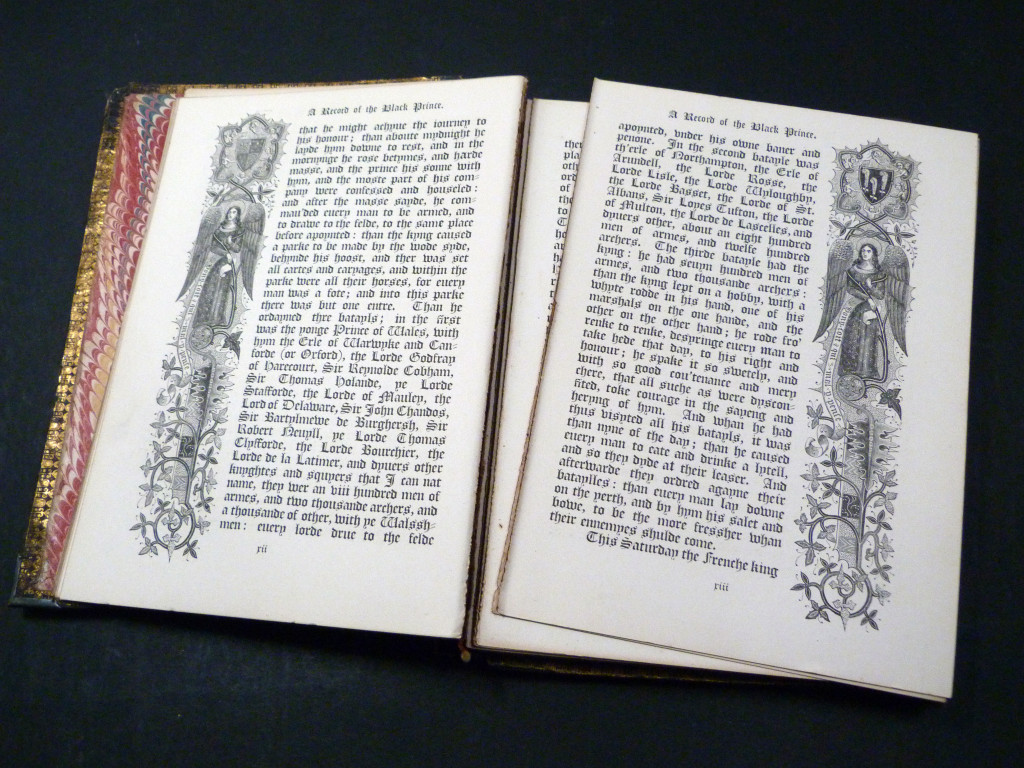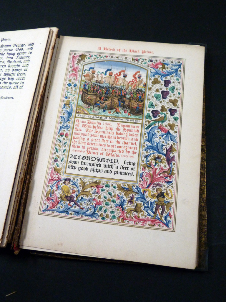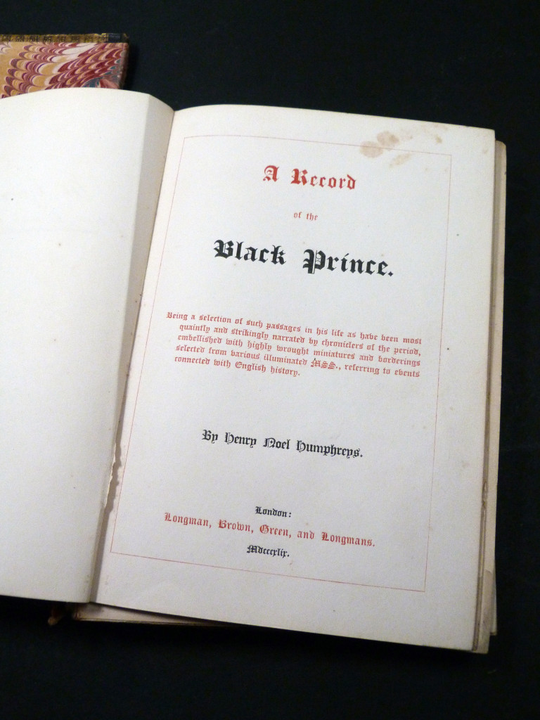 Full title: A Record of the Black Prince. Being a selection of such passages in his life as have been most quaintly and strikingly narrated by chroniclers at the period, embellished with highly wrought miniatures and borderings selected from various illuminated MSS., referring to events connected with English history