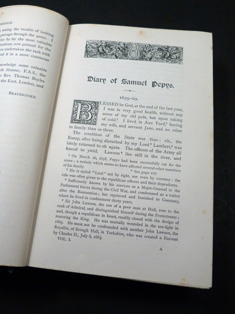 This set presents a reprint of Braybrooke's 1848–1849, with, thankfully, an index. Samuel Pepys' diary was written in shorthand between 1660 and 1669 and not deciphered until 1825 when it was published in parts, and never intended for the public eye. It not only presents a vivid picture of an age, but also a uniquely uninhibited and spontaneous revelation of its author's life and character. As well as daily life in London, Pepys's documents the Restoration of King Charles II, the 1665 Great Plague, and the 1666 Great Fire of London.