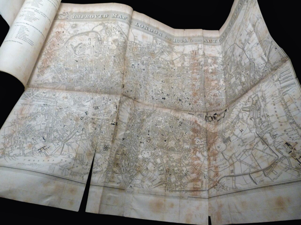 Fair to poor. The leather is in poor condition. Most of the backstrip (the leather spines) has been lost and all boards are detached, rubbed and scuffed. There is old taped reinforcements to hinges. The prelims are quite badly edgeworn and the inner binding for the first few pages of each is weak. The large London map is heavily creased, torn, and foxed with taped repair, the fold-out country map edgeworn but not terrible. The main bodies of text are in better condition, remaining well bound and quite readable. The maps are a little tanned and some with spotted foxing, and a water stain to the lower margin, but with little wear to the edges. The text is complete. The maps are uncoloured.
