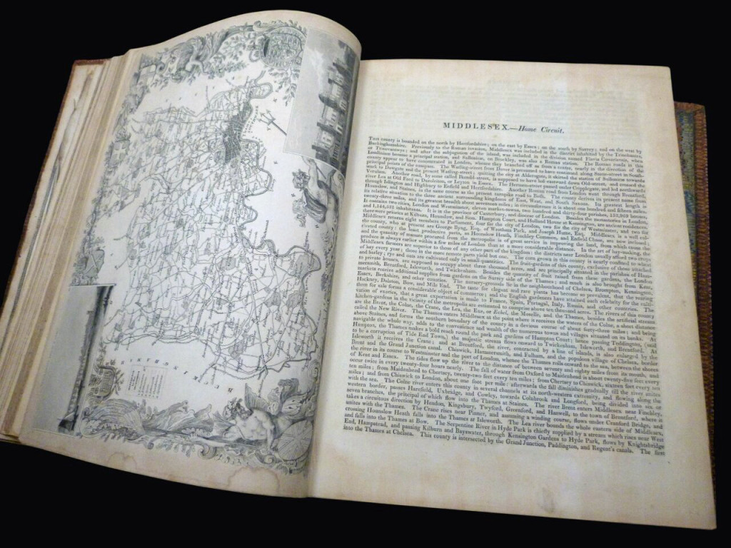 A gazetteer and history of the counties of England which is divided in circuits (the Home Circuit, the Norfolk, the Western, the Oxford, the Midland, and the Northern). The book is best known for its county maps, which are high quality engravings with ornamental borders, local scenes and architectural features of interest.
