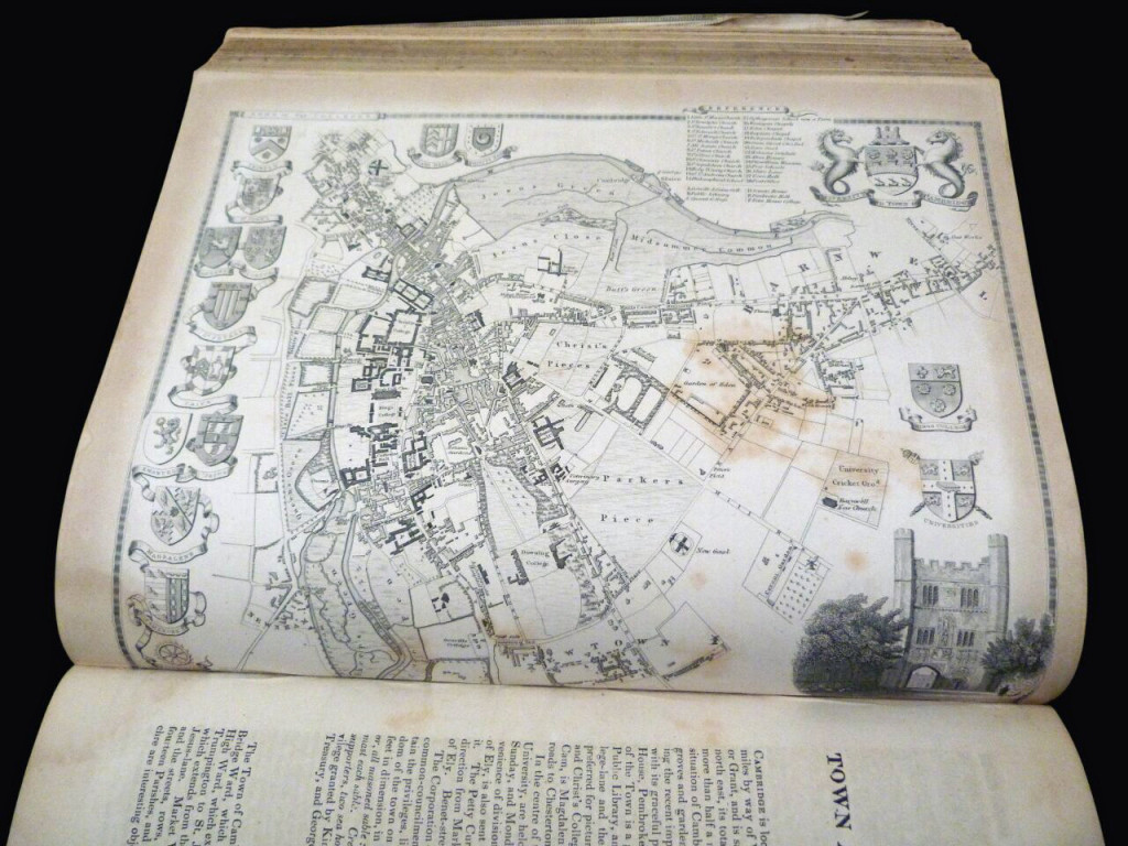 Here is a full collation, and there is some variation from the plate index (noted here). Volume 1: Frontispiece of the King; folding map of London (1834)* the plate index has this later in the book and an overall map of the UK here but the UK map is at the start of vol 2; four single page maps of inland navigation, and "A Comparative View of Some of the Principal Hills in Great Britain", then the county and town maps: Essex, Hertfordshire, Kent, The Isle of Thanet, Middlesex, London Environs, Metropolitan Boroughs (this map is loose and now sits at the start of the book), Surrey, Sussex, Bedfordshire, Buckinghamshire, Cambridgeshire, Cambridge Town and University, Huntingdonshire, Norfolk, Suffolk, Cornwall, Devonshire, Plymouth and Devonport, Dorset, Hampshire, Portsmouth, Isle of Wight, Somersetshire, Bath and Bristol, and Wiltshire. This totals 33 (of 35 listed) but the overall UK map is in Vol 2, and the town plan of Bath is the only one lacking (but this is compensated for by the addition of a county map of Monmouthshire, also in vol 2).