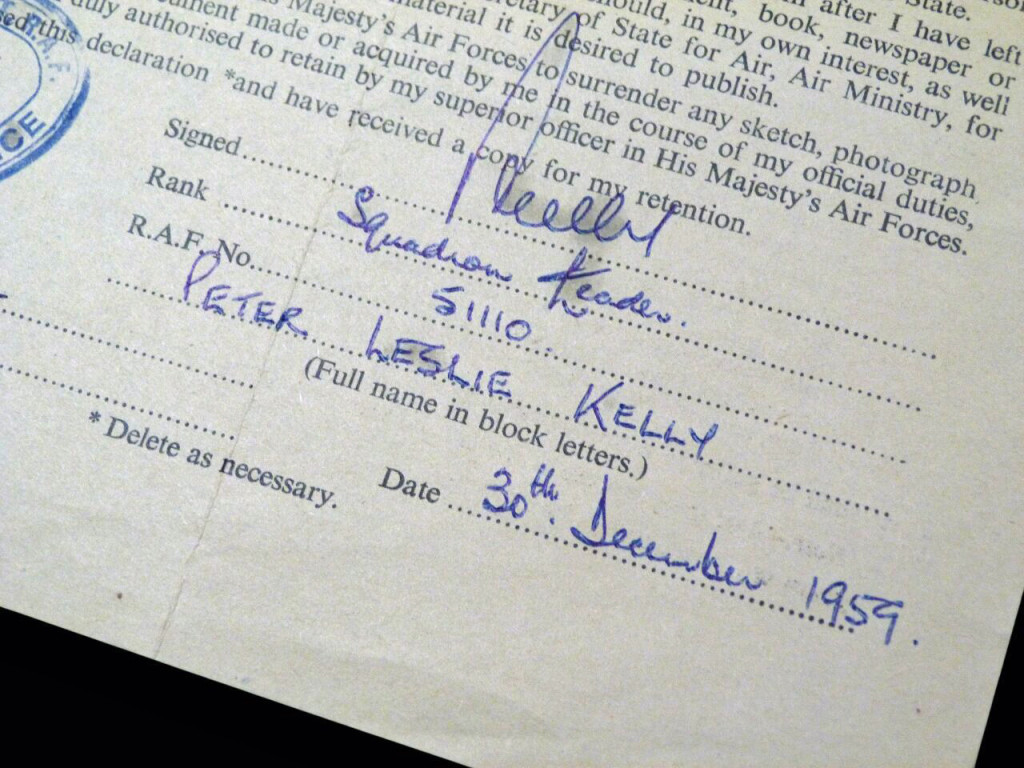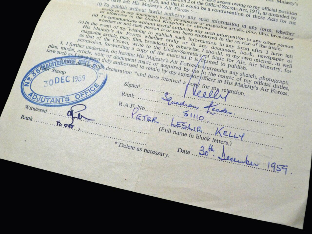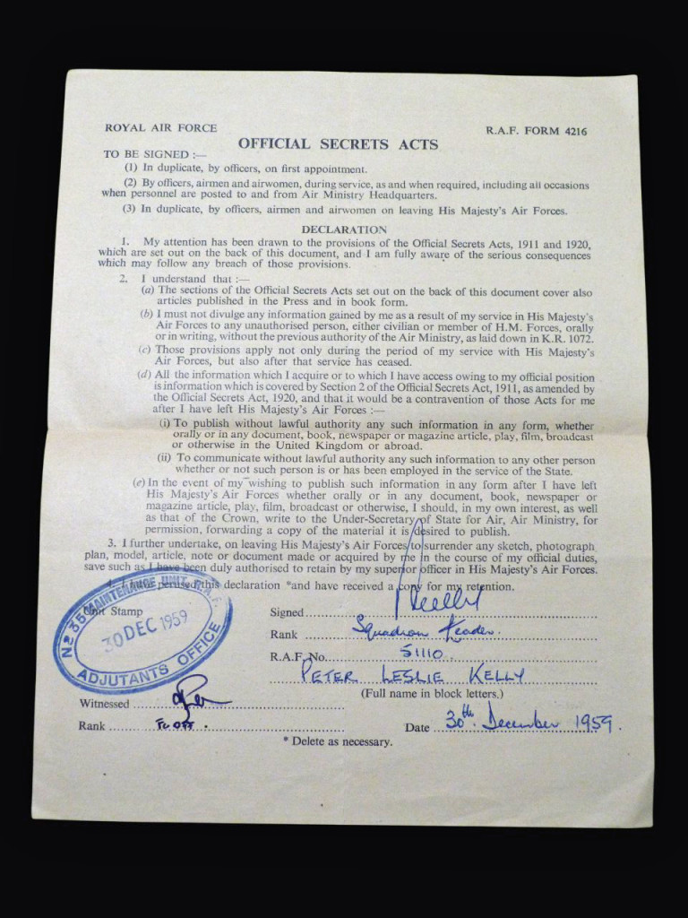 This is an original copy of the Official Secrets Act, signed by a senior RAF officer in 1959. It is RAF Form 4216 and was signed by Squadron Leader Peter Leslie Kelly (Service No. 51110), and was signed 30th December 1959. It was signed as Sq Ldr Kelly retired from the service, his last unit being No. 35 Maintenance Unit, RAF (Adjutant's Office).