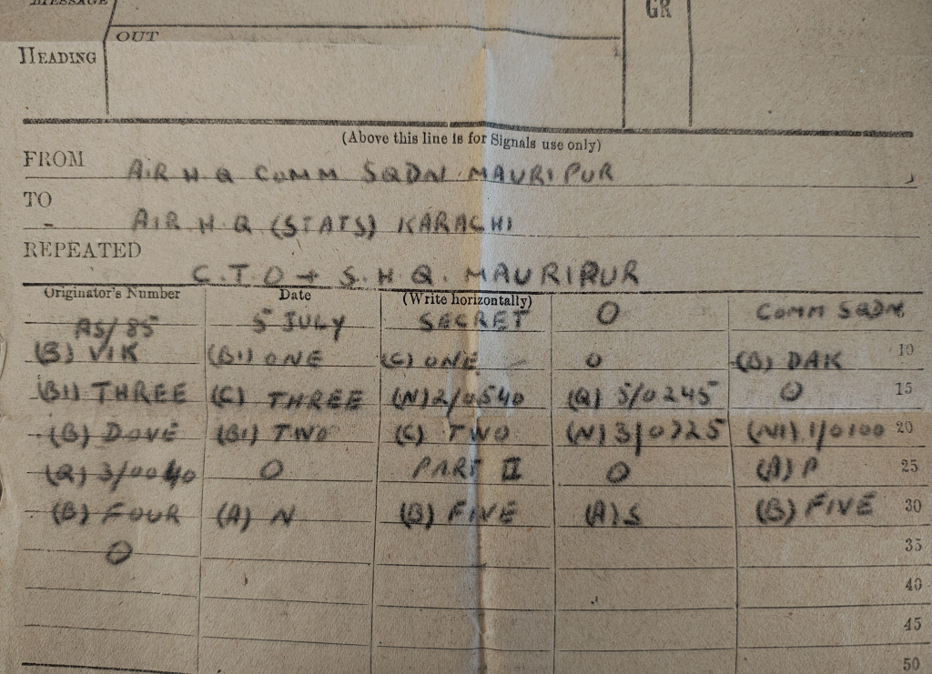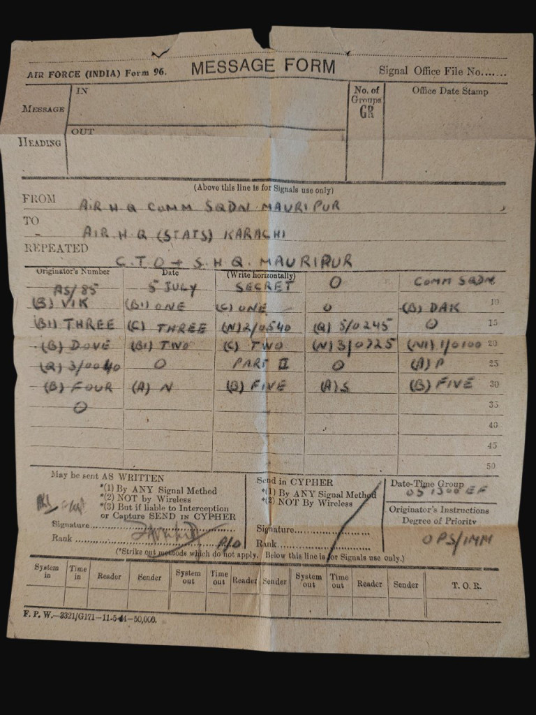The message: This has been written down on an old Air Force (India) form dated 1944, but the message is from 1951. It was sent from Air HQ Comm Sqdn Mauripur to Air HQ Stats Karachi and repeated to C.T.O. + S.H.Q. Mauripur (Chief Technical Officer and Station Head Quarters). The message appears coded, or at least in military parlance and not meant to read by anyone else. The message text reads: "[b][i]AS/85 /5 JULY /SECRET / O / COMM SQDN / (B) VIK / (B1) ONE / (C) ONE / O / (B) DAK / (B1) THREE / (C) THREE / (N) 2/0540 /(Q) 5/0245 / O / (B) DOVE / (B1) TWO / (C) TWO / (N) 3/0725 /(NI) 1/0100 / (Q) 3/0040/ O /PART II / O / (B) P / (B) FOUR / (A) N / (B) FIVE /(A) S / B (FIVE)[/i][/b]"