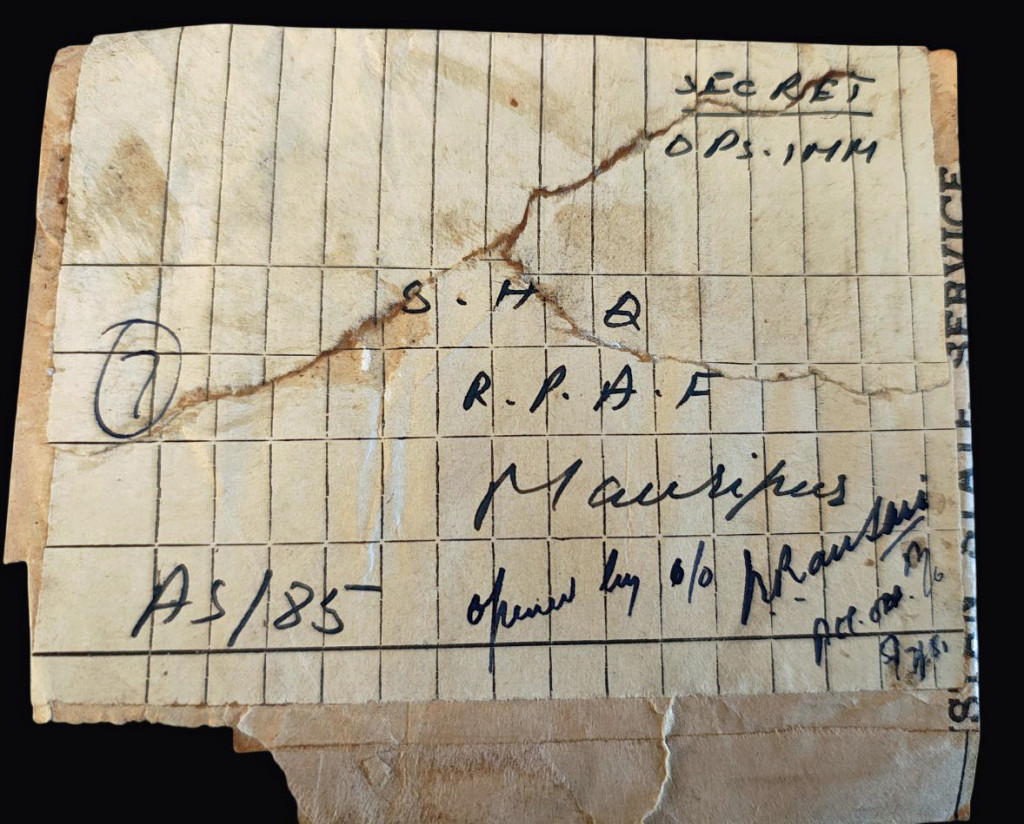 The envelope: This has been opened hastily, with paper label covering to the front, on which is written "Secret" and "Ops Imm" (believed to be Operations Immediate, meaning it required immediate action), and sent to HQ of the RPAF at Mauripur, with a handwritten note of who it was opened by on 5th July 1951.