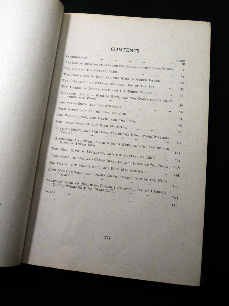 A collection of sixteen Irish folk tales taken from Irish-American anthropologist and oral tradition collector Jeremiah Curtin's column in the New York newspaper The Sun between 1892 and 1893. Contents: The Son of the King of Erin and the Queen of the Moving Wheel; The Bird of the Golden Land; The King’s Son in Erin and the King of Green Island; The Fisherman of Kinsale and the Hag of the Sea; The Tinker of Ballingarry and his Three Wishes; Baranoir, son of a King in Erin, and the Daughter of King under the Wave; The Share-smith and the Stranger; Gold Apple, son of the King of Erin; The Widow’s Son, the Devil, and the Fool; The Three Sons of the King of Antua; Sgiathán Dearg, and the daughter of the King of the Western World; Fáinne óir, daughter of the King of Erin, and the son of the King of Three Seas; The High King of Lochlann, and the Fenians of Erin; Finn mac Cumhaill and Conan Maol in the House at the Rock; Sál Fhada, the King’s son, and Finn mac Cumhaill; Finn mac Cumhaill and Iolann Iolchrothach, son of the King of Spain.