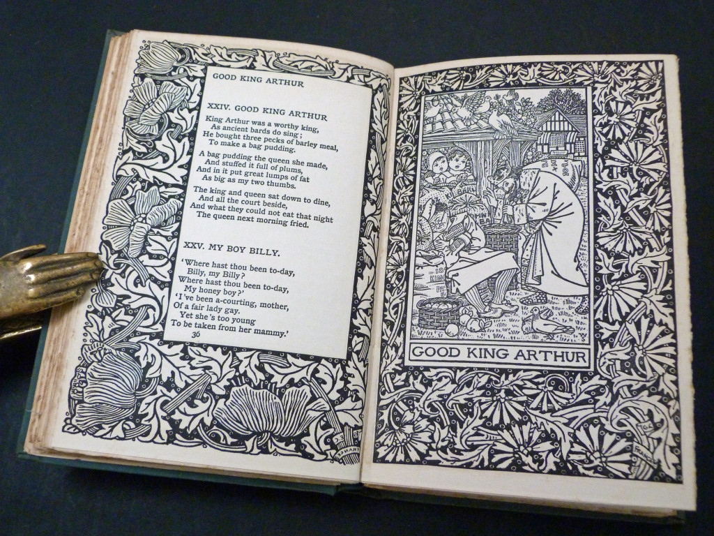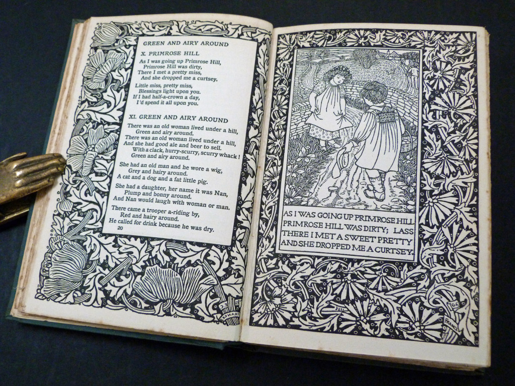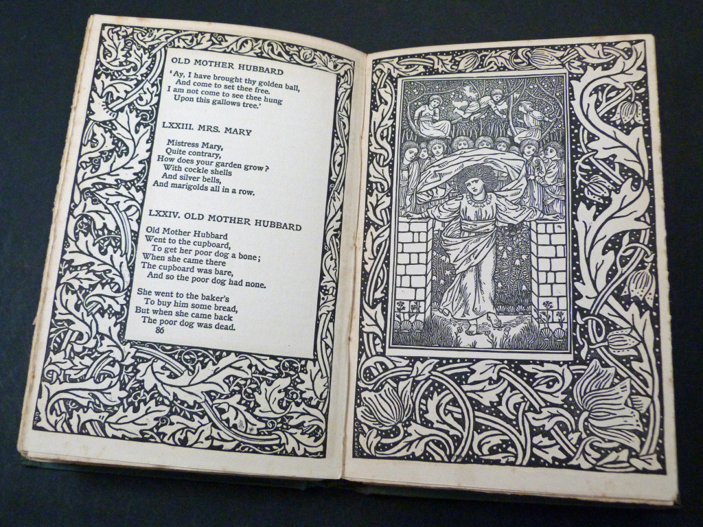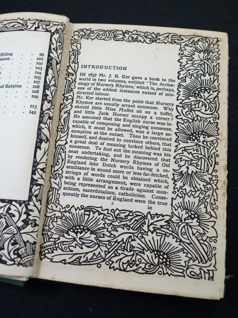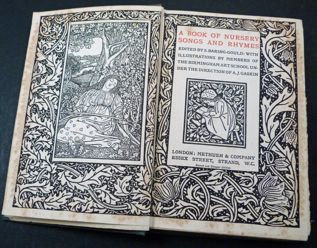 A collection of 77 nursery songs, ten game rhymes and 91 short nursery jingles follow Baring-Gould interesting introduction to these songs and rhymes. The book is a wonderful example of late Victorian, early Edwardian printing and book design, with each page having an ornate printed border, some of which frame an illustration by a member of the Birmingham Art School, which at the time was a leading centre for the Arts and Crafts Movement. The border was designed by Georgie Evelyn Cave France (1866–1934), the illustrations were by students from the Birmingham Art School taught by Arthur Joseph Gaskin (1862–1928).