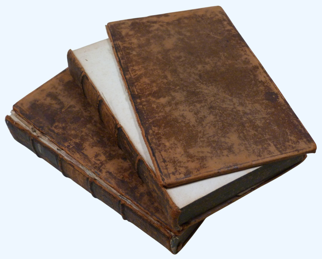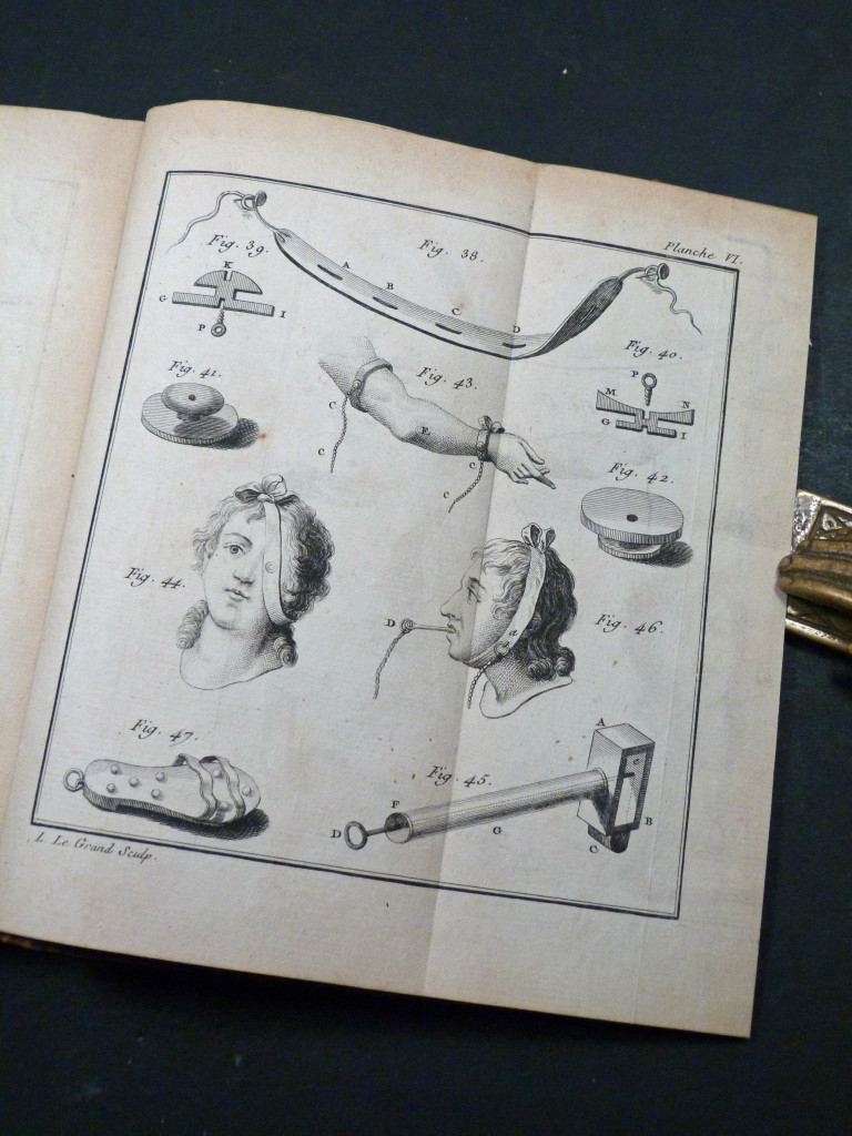 First edition, second issue. Two volumes (complete). Full leather (defective). Each 20 × 12.5cm. Vol 1: xxxiv [2], 522pp [1]; vol 2: iv, 509pp [4], with six folding plates. French text.